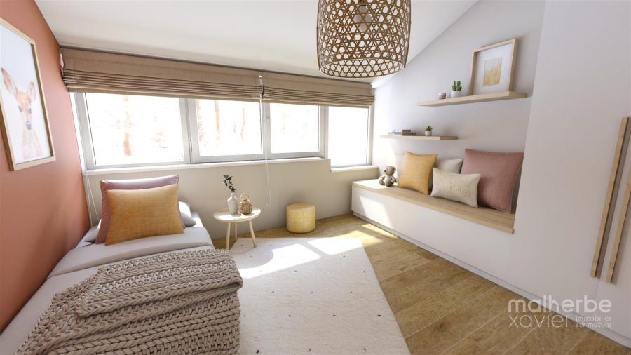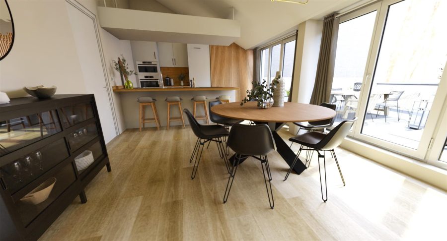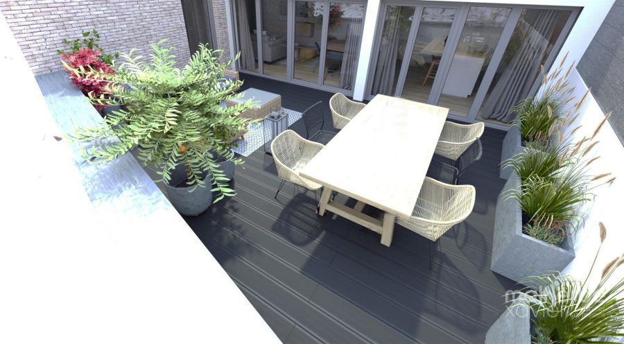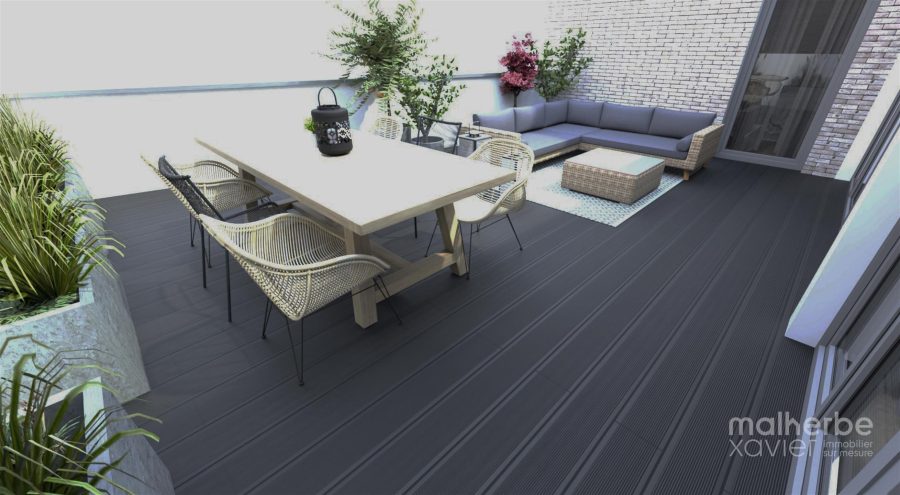 – L’ensemble de l’appartement sera carrelé (ou parquet) à votre choix (BigMat Giet-Bodarwe) ; la terrasse en dalles sur plots