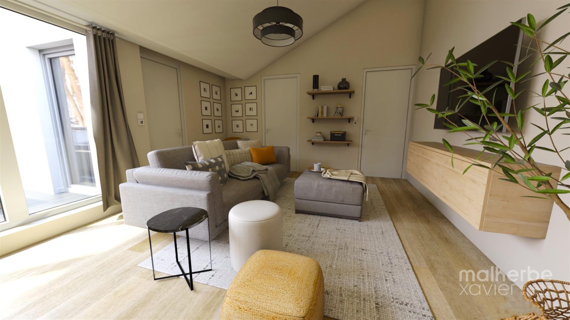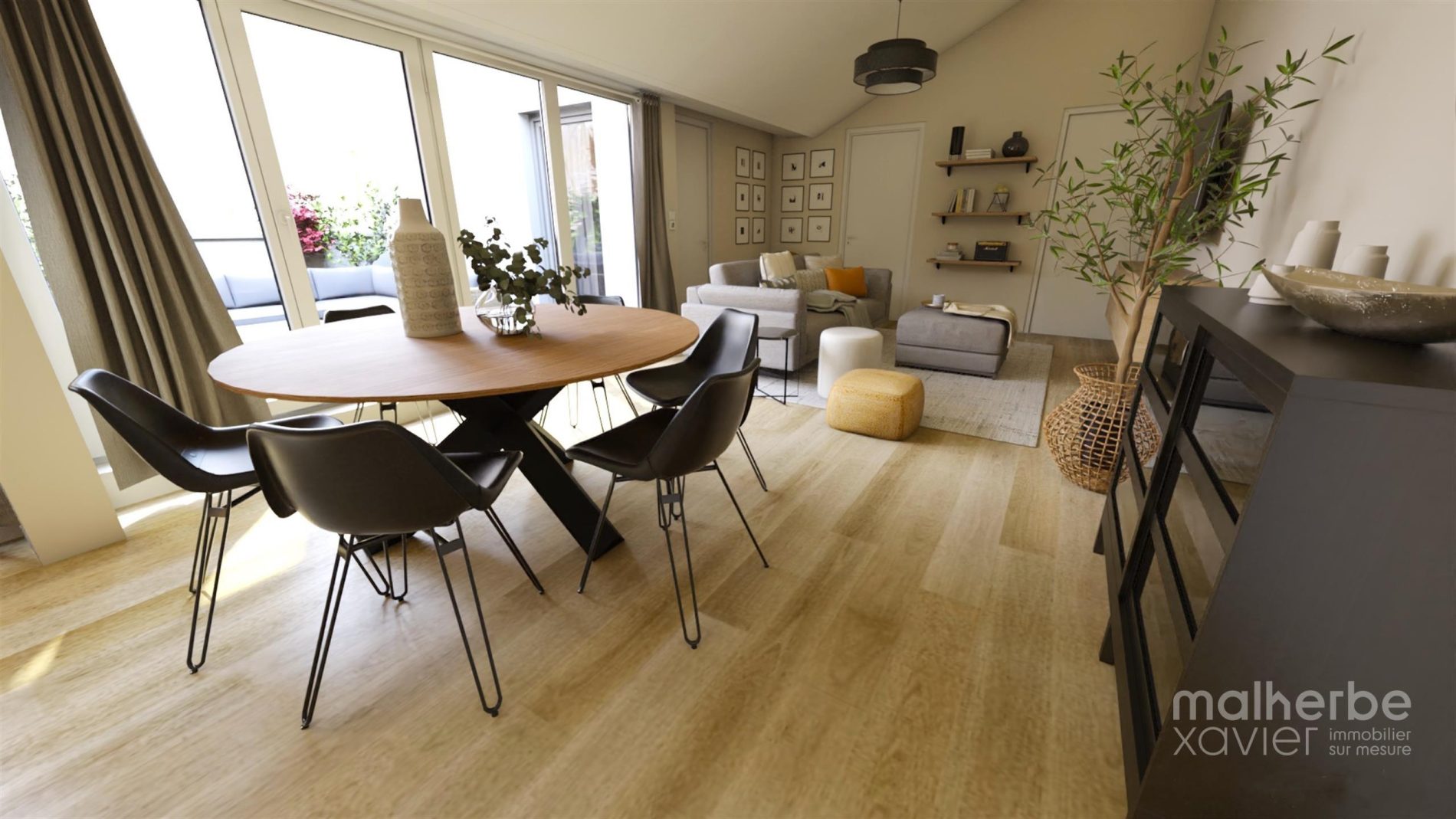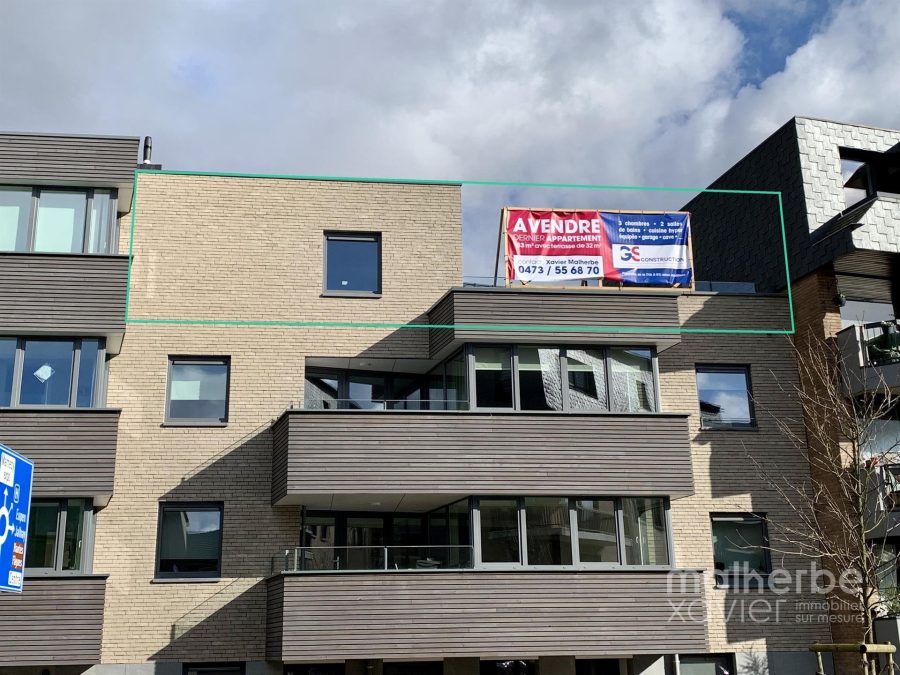 3e étage : palier, appartement : hall d’entrée avec vestiaire et wc, living très lumineux ouvert sur la cuisine équipée avec espace repas et donnant accès à la terrasse, buanderie, trois chambres à coucher, deux salles de bains équipées