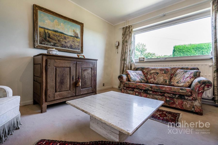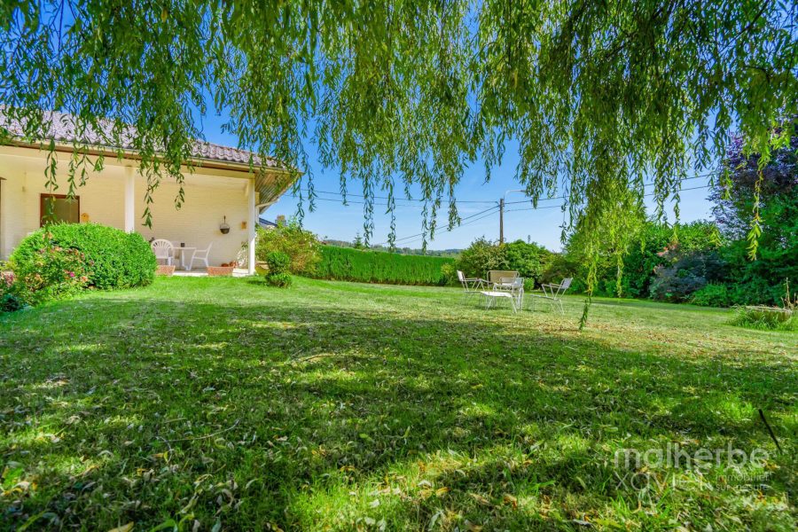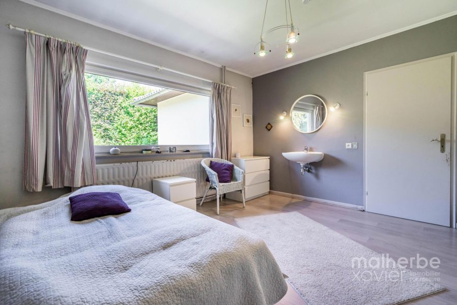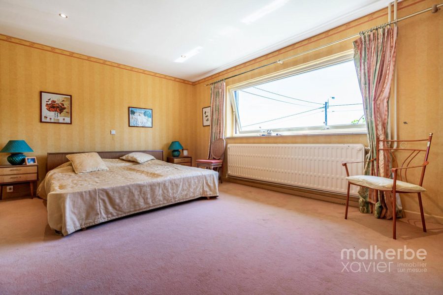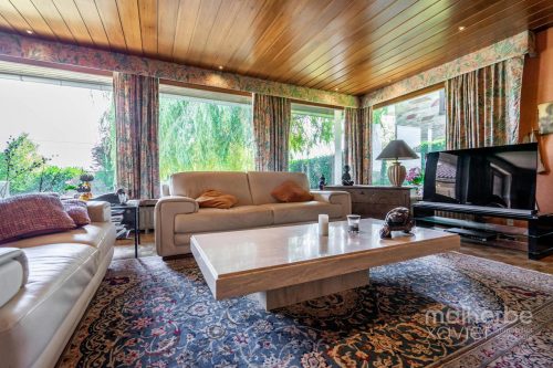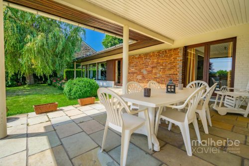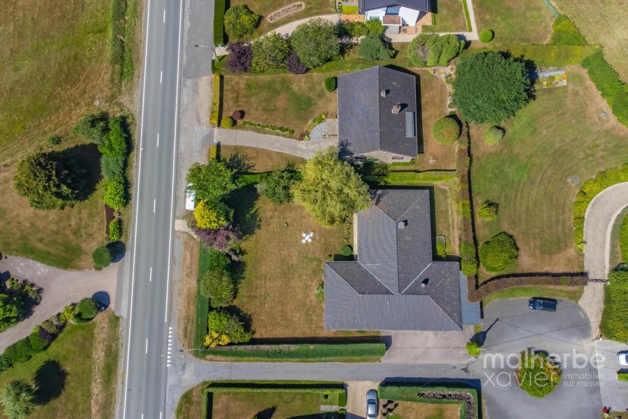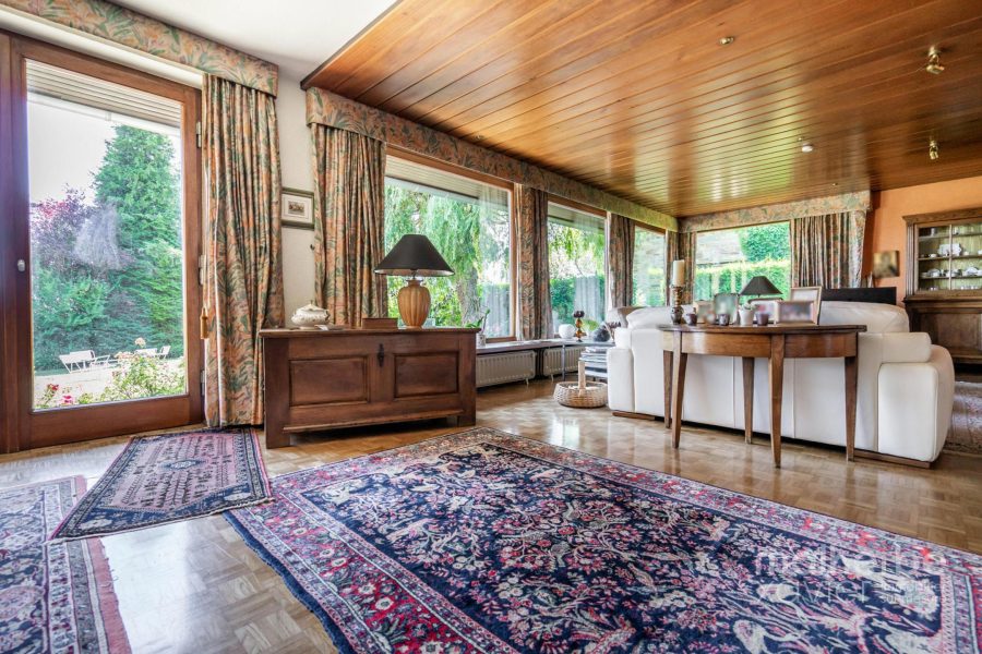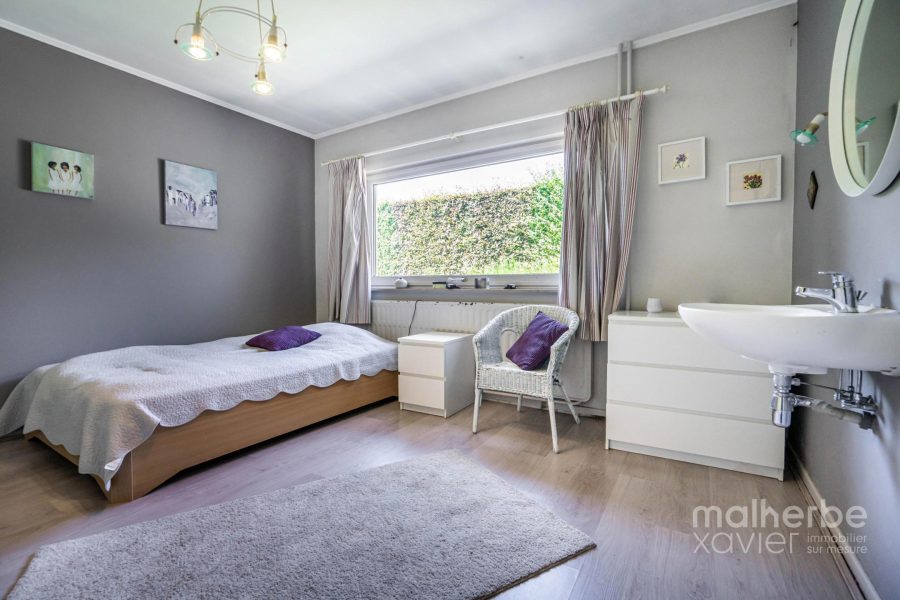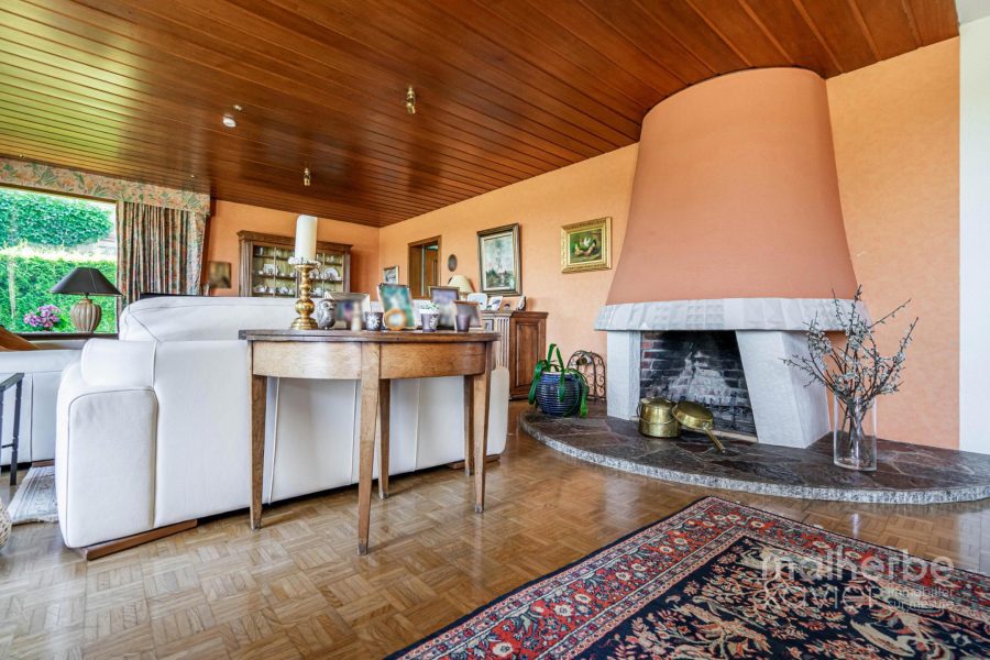 – Rez-de-chaussée : hall d’entrée carrelé avec wc, superbe living lumineux (68 m²) avec feu ouvert donnant accès à la terrasse et au jardin, cuisine équipée carrelée avec espace repas donnant accès à la terrasse et au jardin, quatre chambres à coucher, bureau avec entrée indépendante, salle de bains équipée, buanderie, garage deux voitures