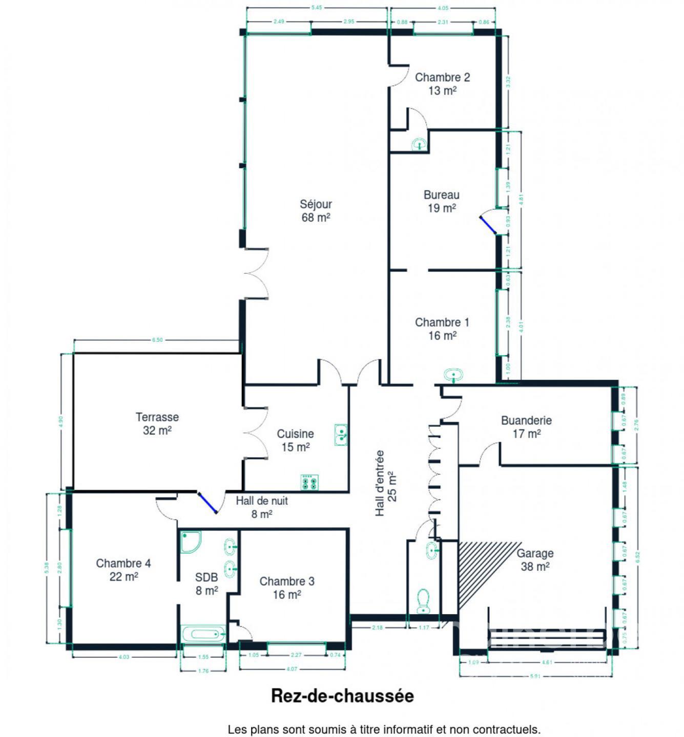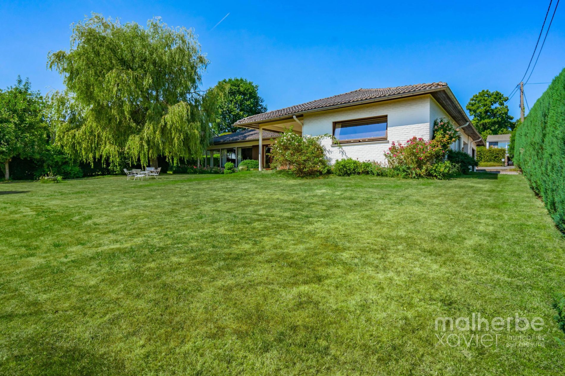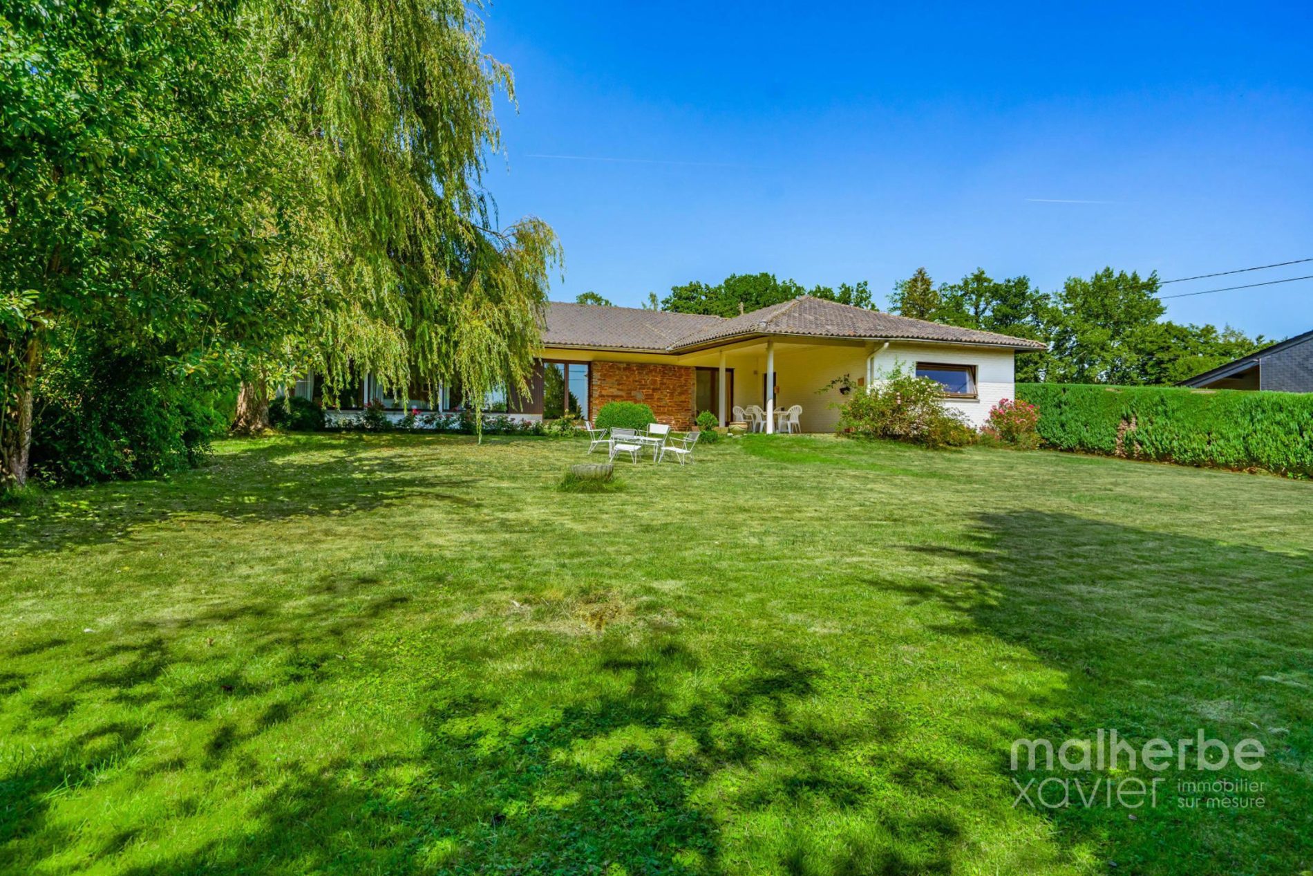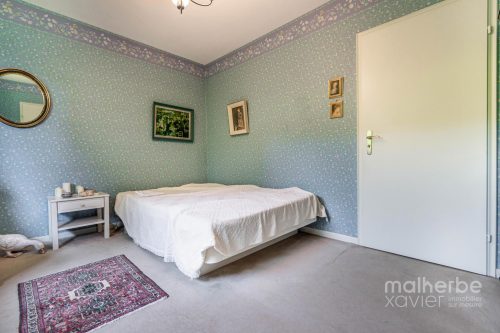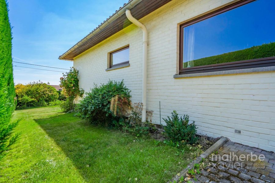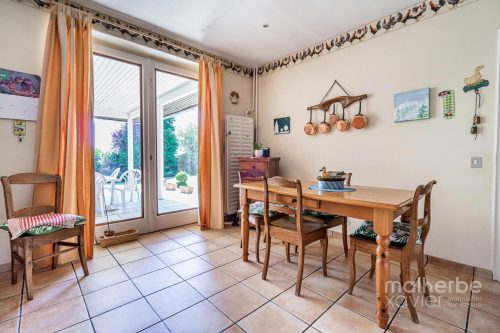 – Rez-de-chaussée : hall d’entrée carrelé avec wc, superbe living lumineux (68 m²) avec feu ouvert donnant accès à la terrasse et au jardin, cuisine équipée carrelée avec espace repas donnant accès à la terrasse et au jardin, quatre chambres à coucher, bureau avec entrée indépendante, salle de bains équipée, buanderie, garage deux voitures