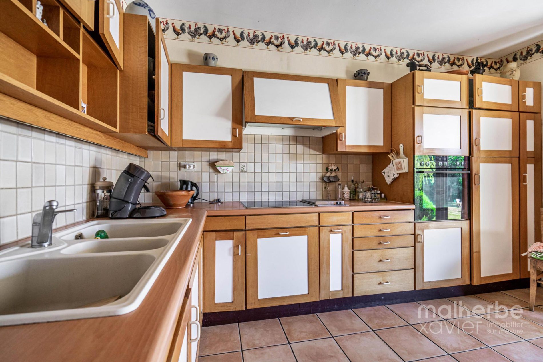 – Cuisine équipée : nombreux meubles sur mesure, une taque vitro céramique quatre zones, four, hotte, double évier, friteuse encastrée