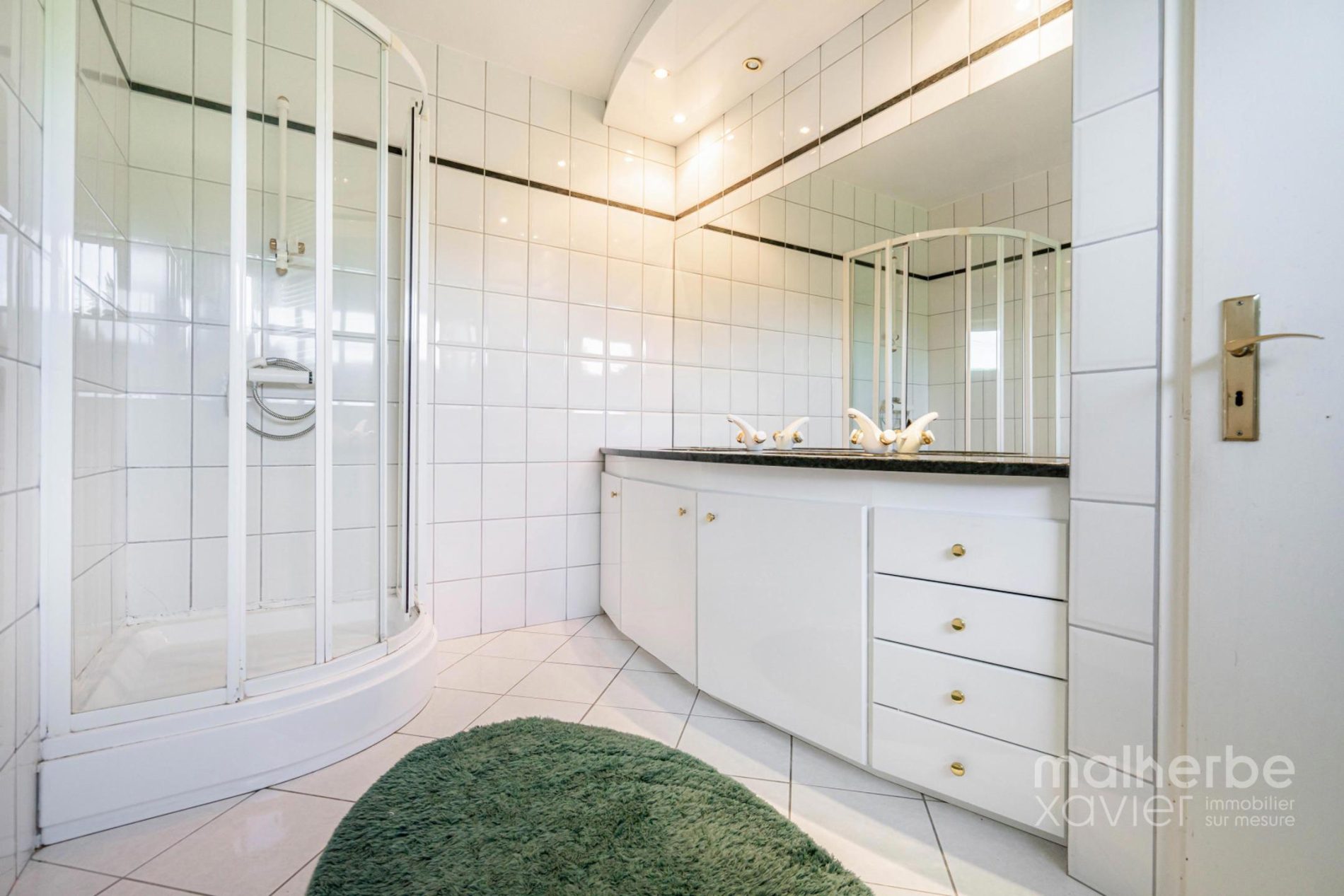– Salle de bains équipée, carrelée murs et sol : bain, douche, meuble double lavabo avec miroir