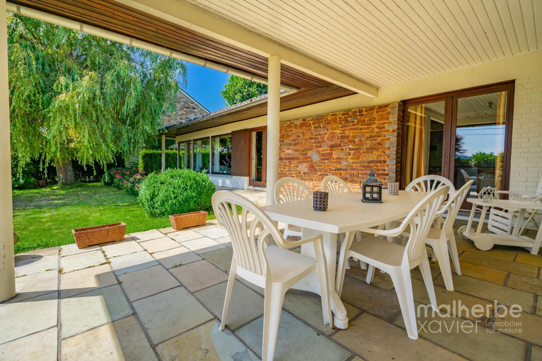 – Extérieur : parking privé en façade, terrasse couverte (32 m²), jardin fleuri et arboré très bien ensoleillé, environnement calme plein de charme, superbe vue