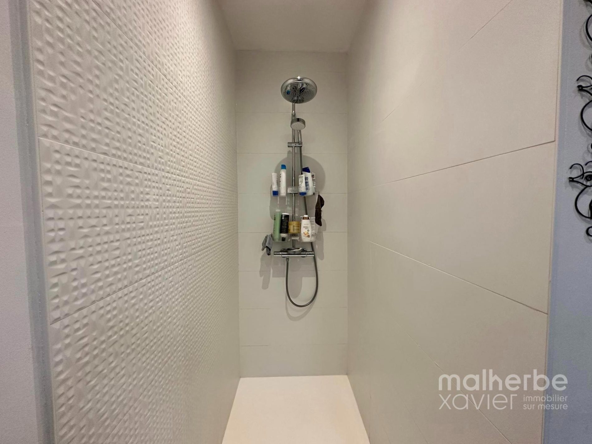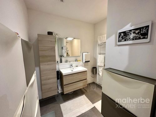 – Salle de bains équipée carrelée : grande douche « à l’italienne’, meuble lavabo avec miroir et éclairage, meuble colonne de rangement, radiateur porte serviette