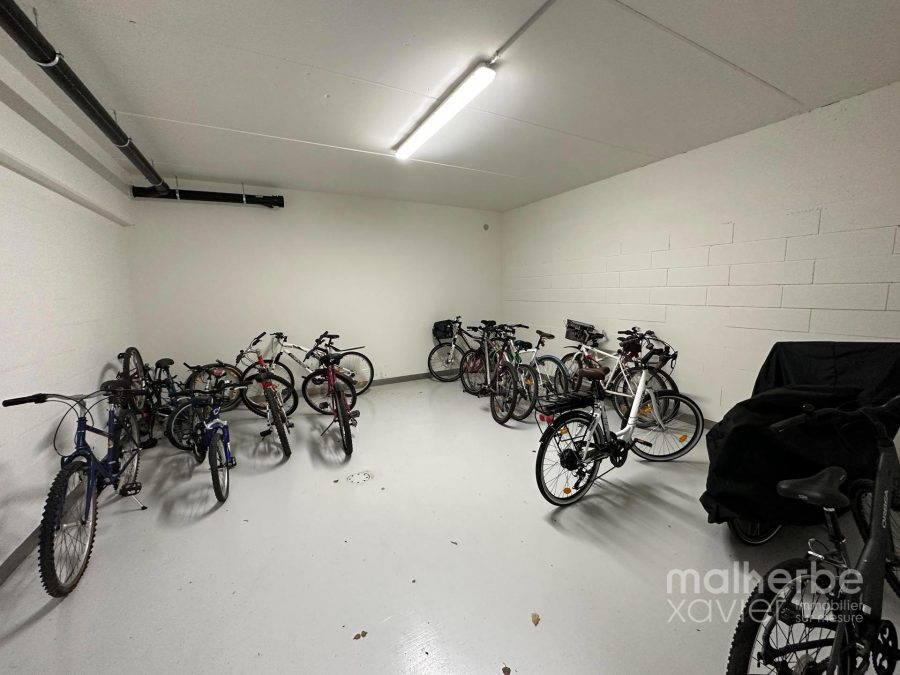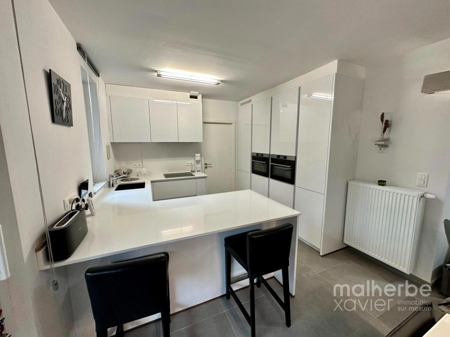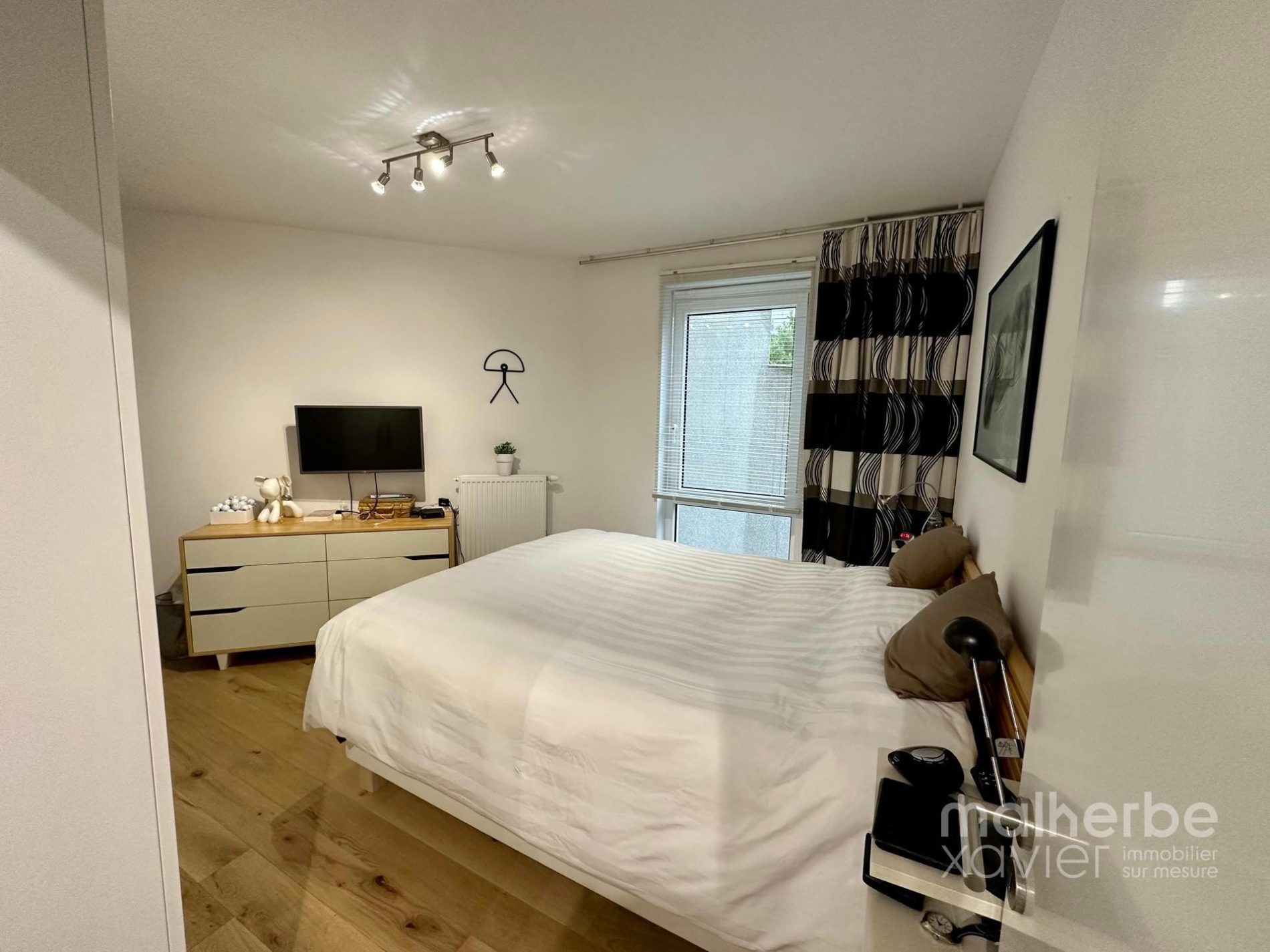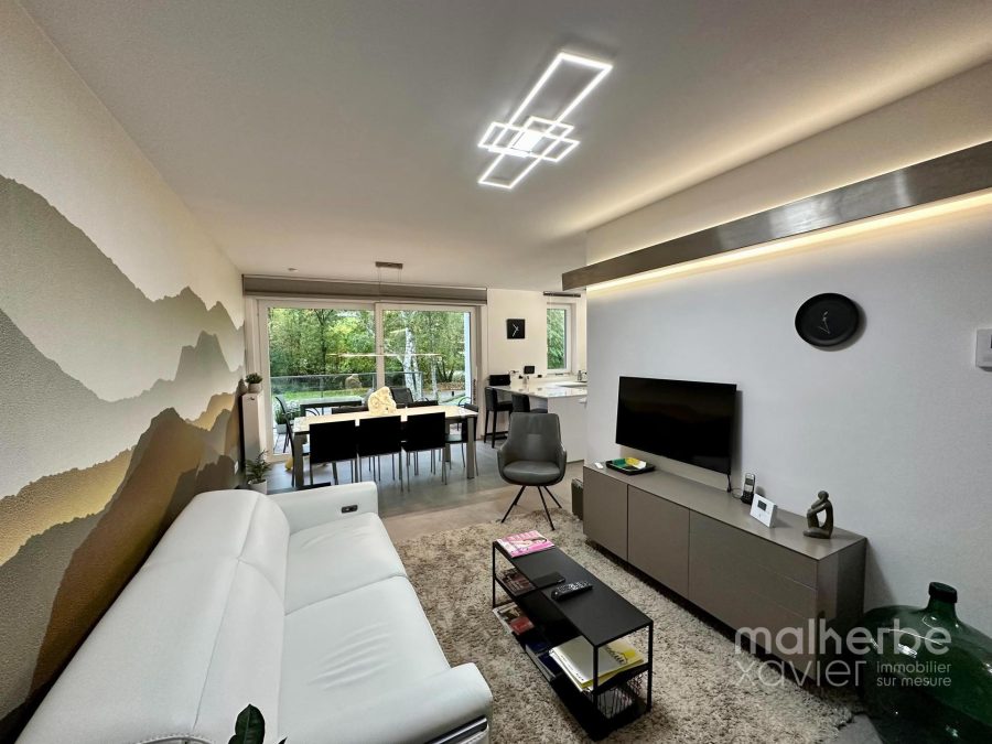 Appartement : hall d’entrée, living en « L » très lumineux ouvert sur la cuisine équipée donnant accès à la terrasse, hall de nuit, deux chambres à coucher, salle de bains équipée, wc indépendant