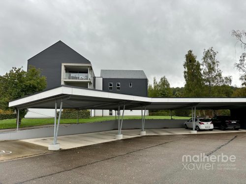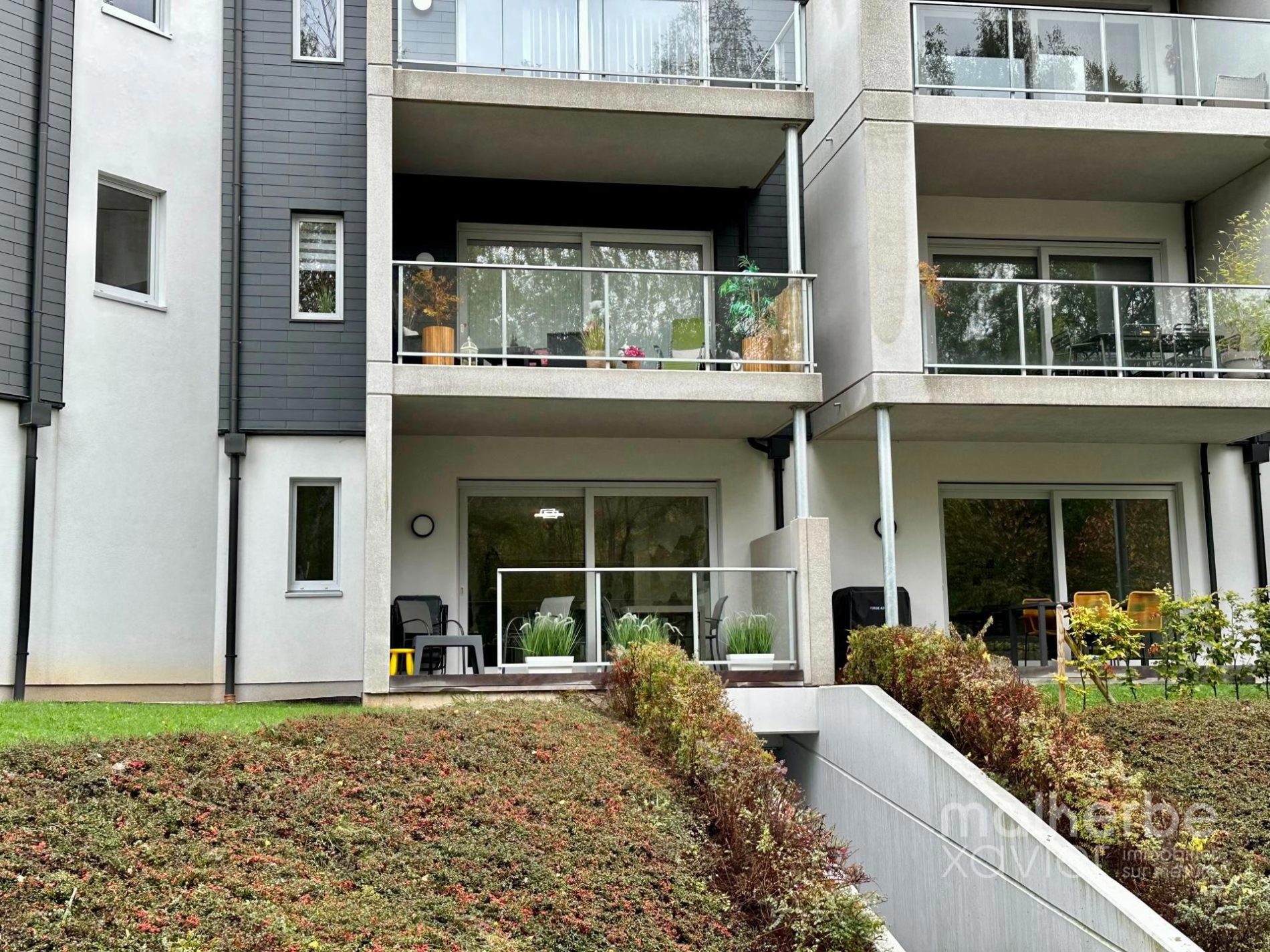 Extérieur : superbe terrasse de 10 m² orientée Sud donnant accès au jardin de la co-propriété, deux places de parking dont une sous car-port
