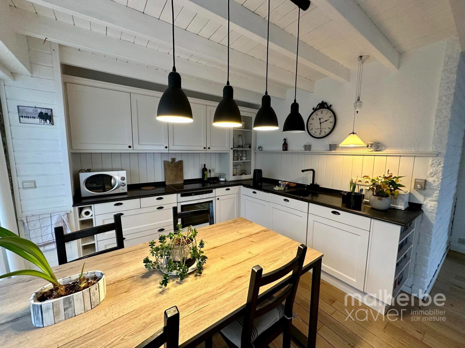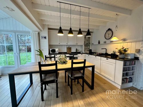 – Cuisine équipée : meubles sur mesure, taque vitro-céramique 4 zones, hotte, four, frigo, évier