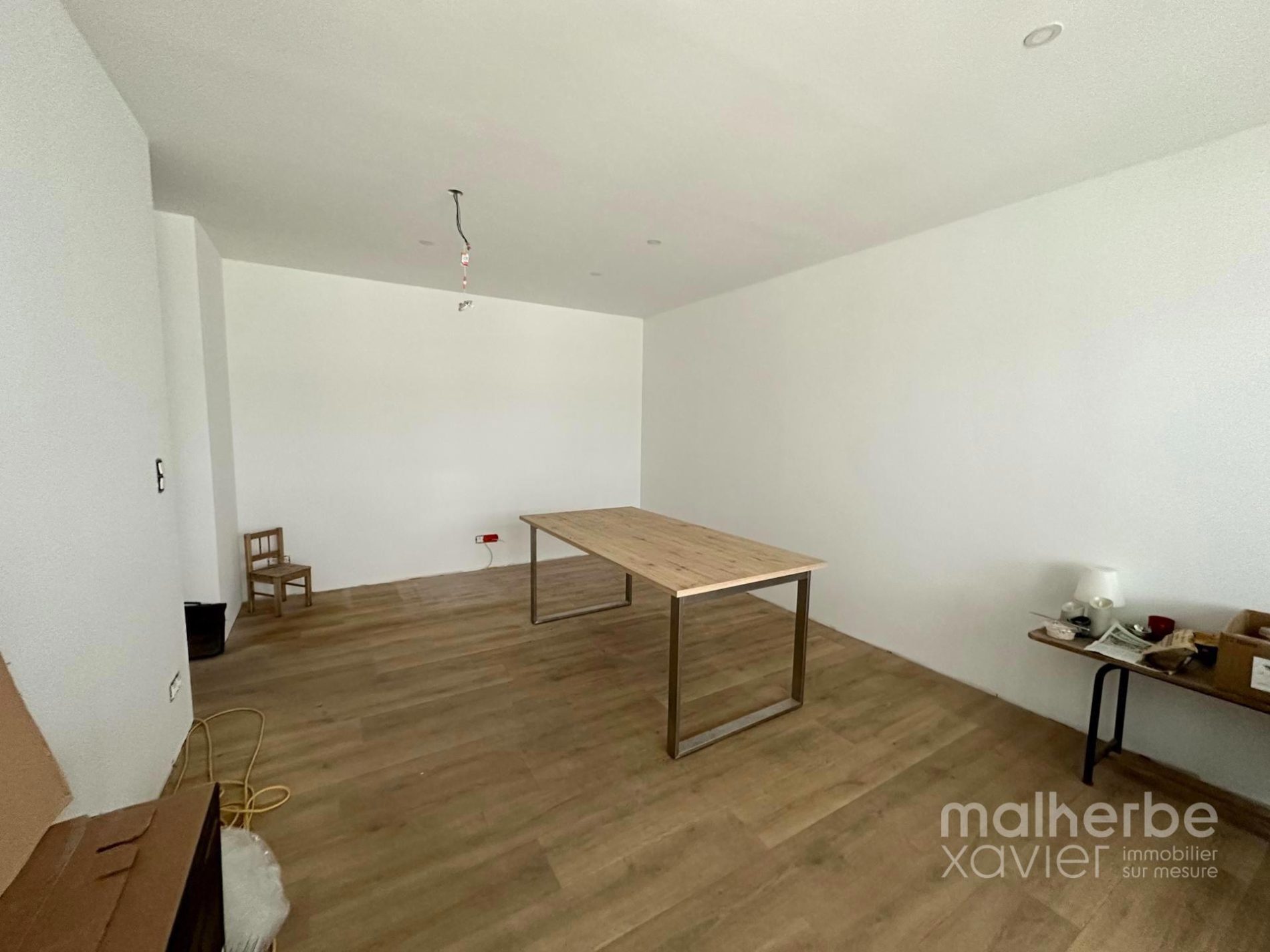– 1er étage : living très lumineux ouvert sur la cuisine équipée avec espace repas et donnant accès à la terrasse; débarras