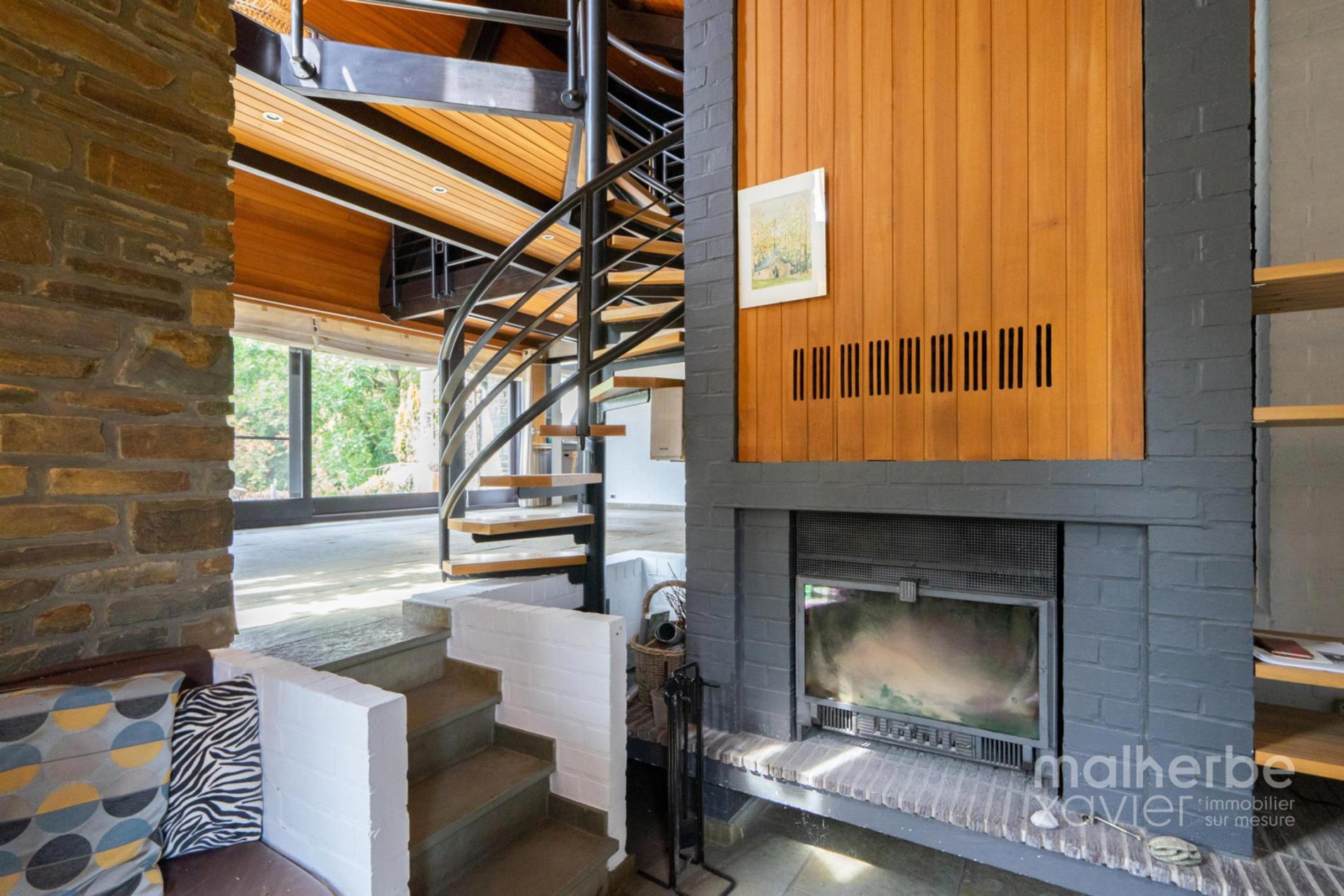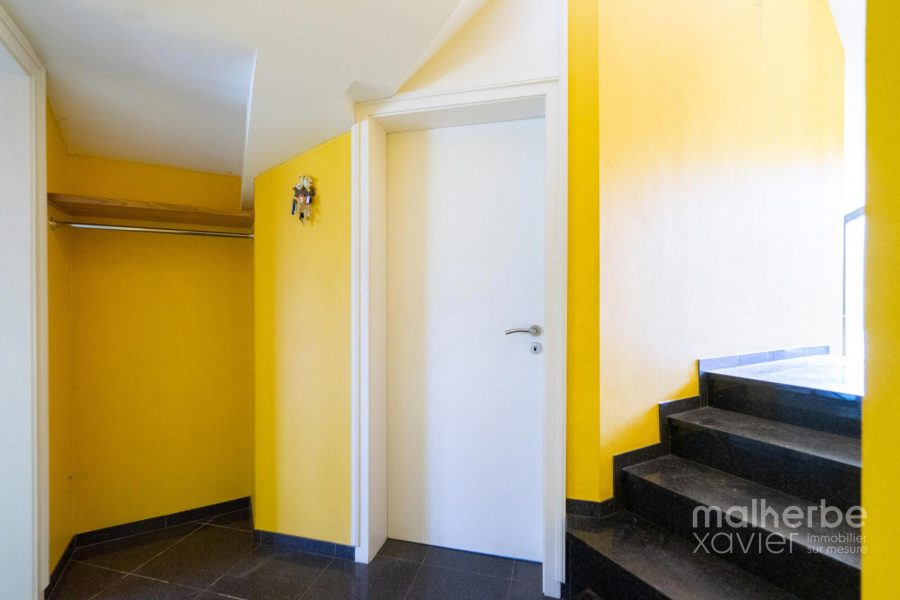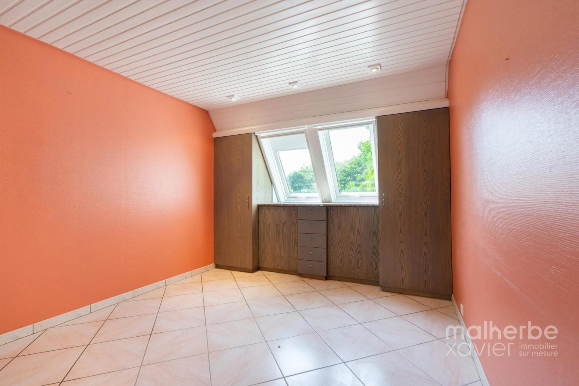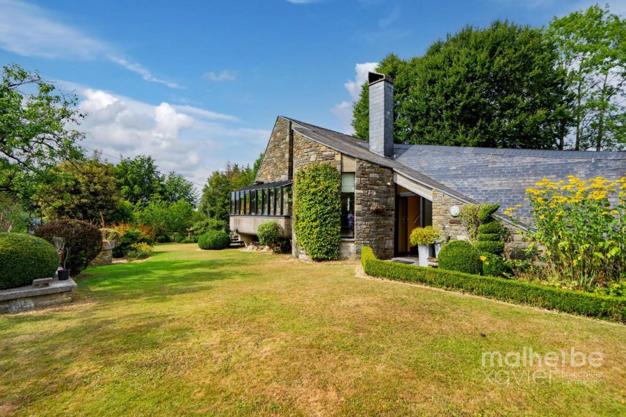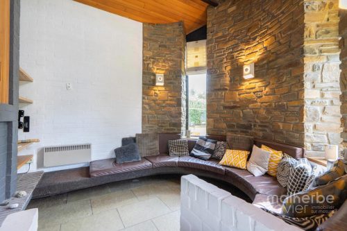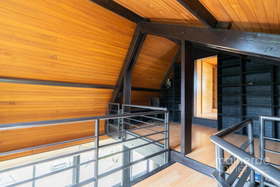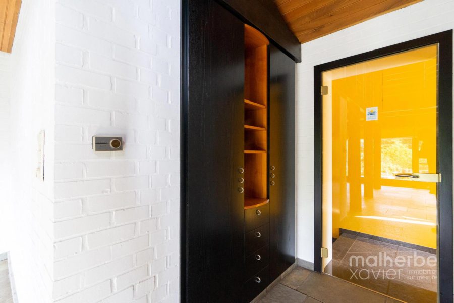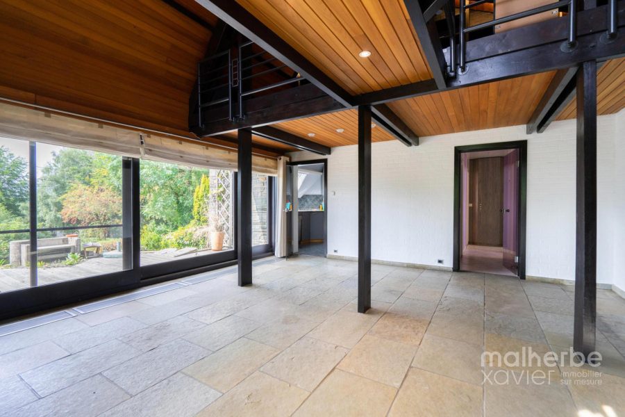 Rez-de-chaussée : hall d’entrée desservant le living, le bureau et le garage; vaste living lumineux donnant accès à la terrasse avec espace salon (cassette à bois encastrée) , véranda donnant accès au jardin, cuisine équipée, hall de nuit desservant trois belles chambres à coucher, salle de bains équipée