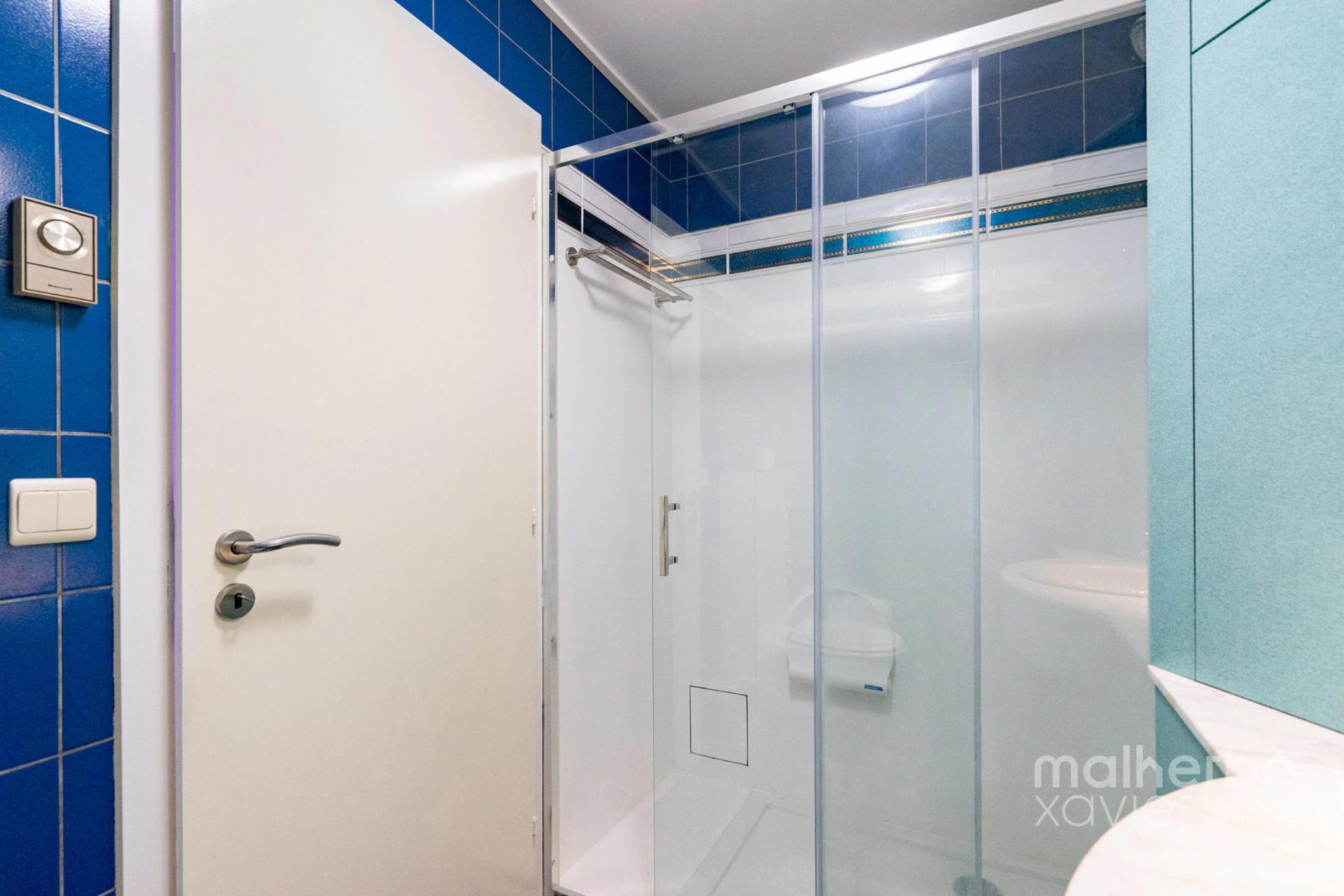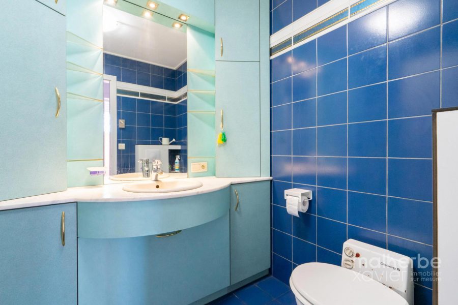 – Salle de bains équipée carrelée mur et sol : meuble lavabo sur mesure avec miroir éclairé, douche, wc