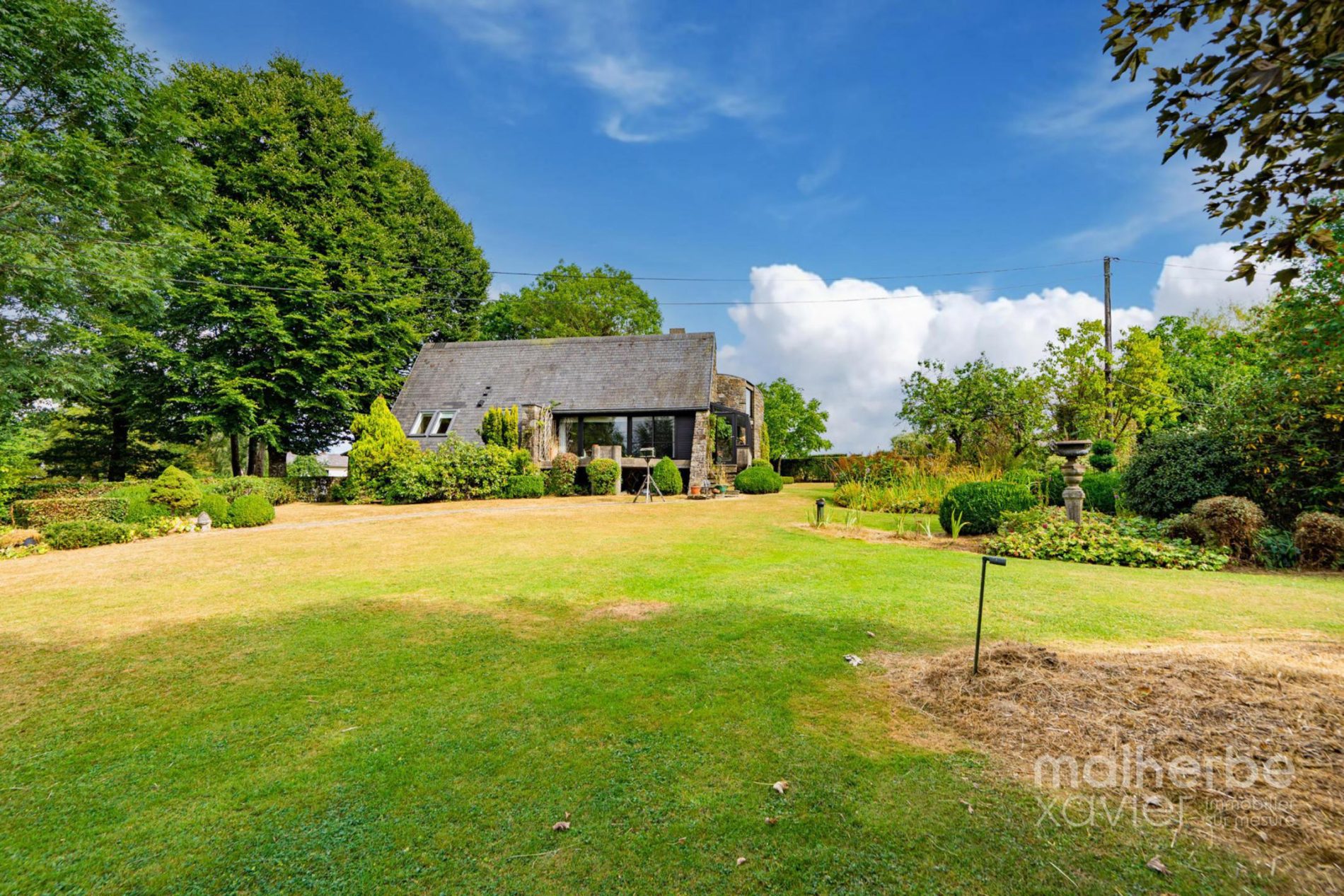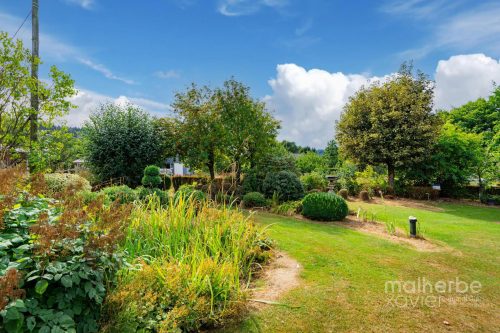Extérieur : parking privé en façade avant, terrasse, jardin fleuri et arboré, marre