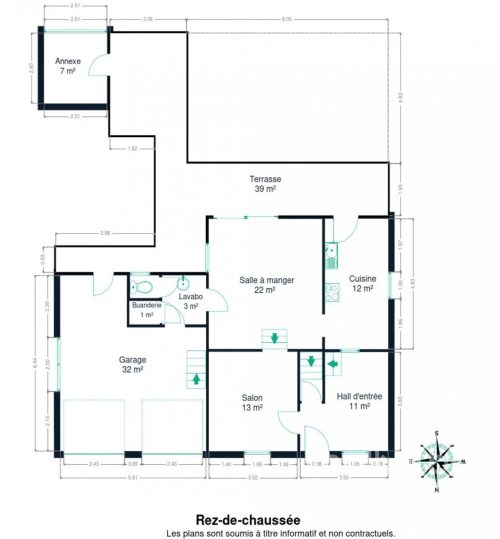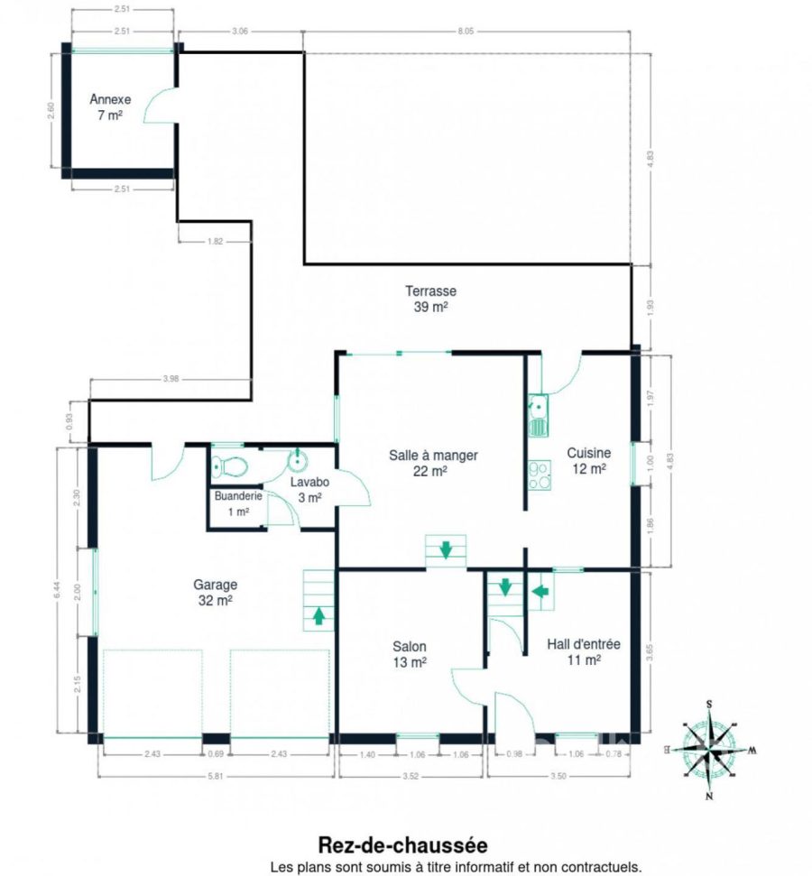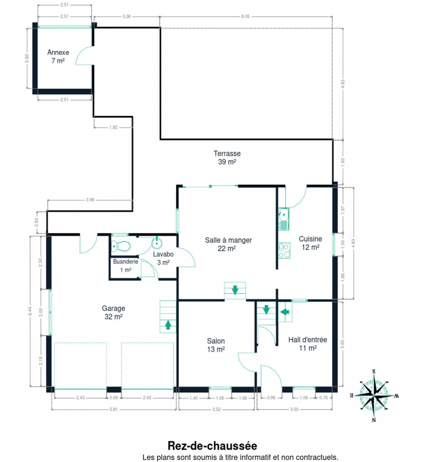 Rez-de-chaussée : vaste hall d’entrée, living traversant donnant accès à la terrasse et au jardin, cuisine équipée donnant accès à la terrasse et au jardin, buanderie, wc indépendant, garages