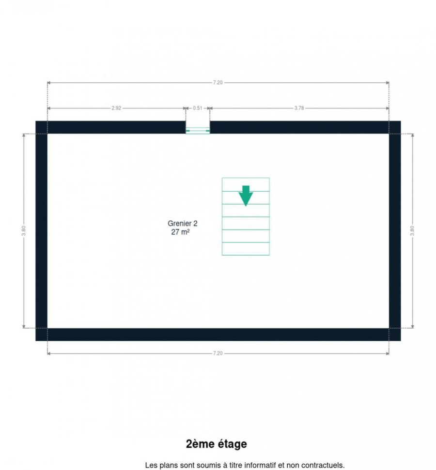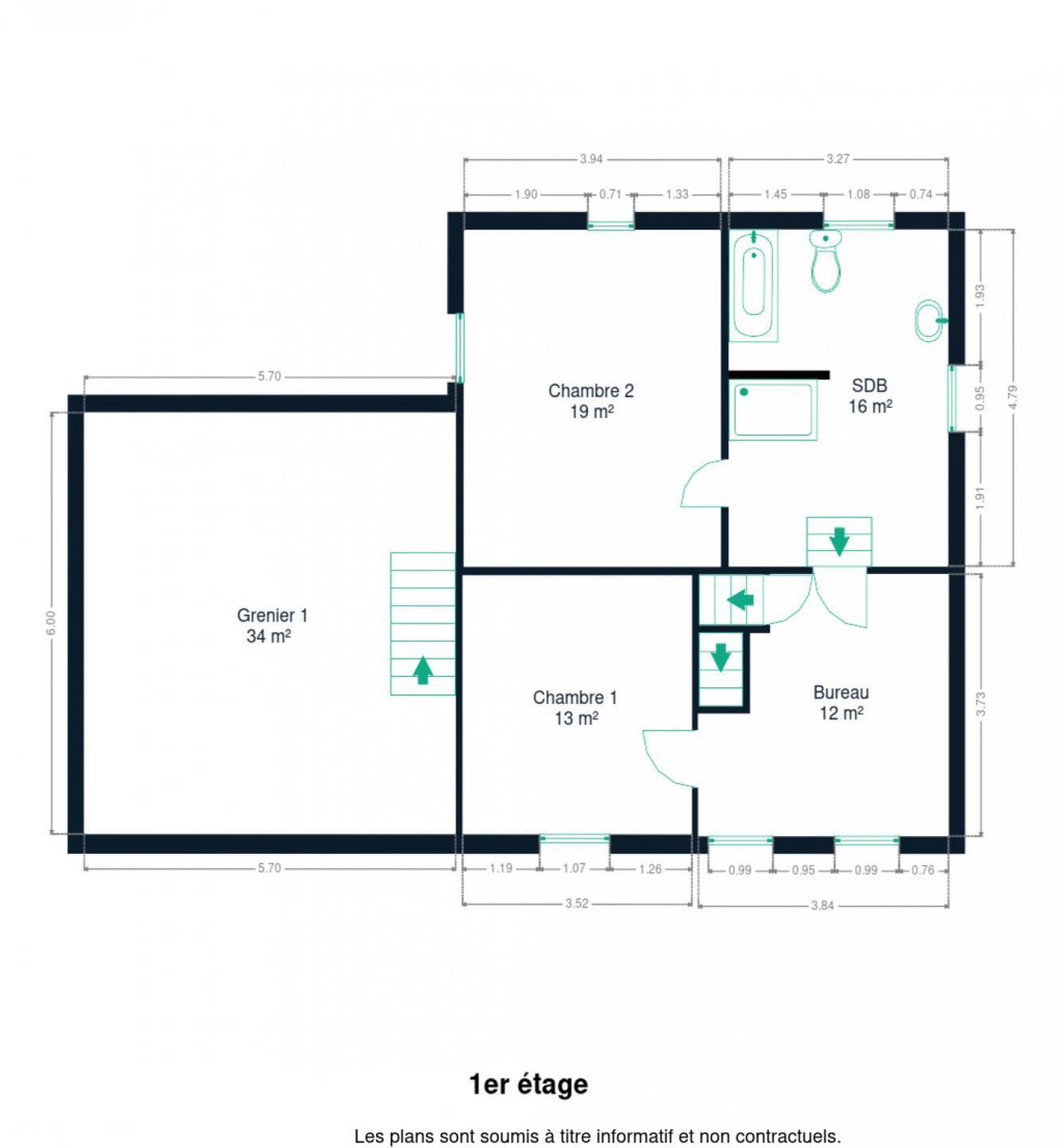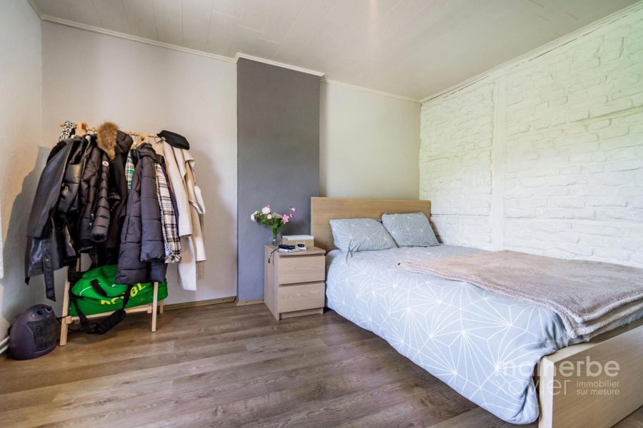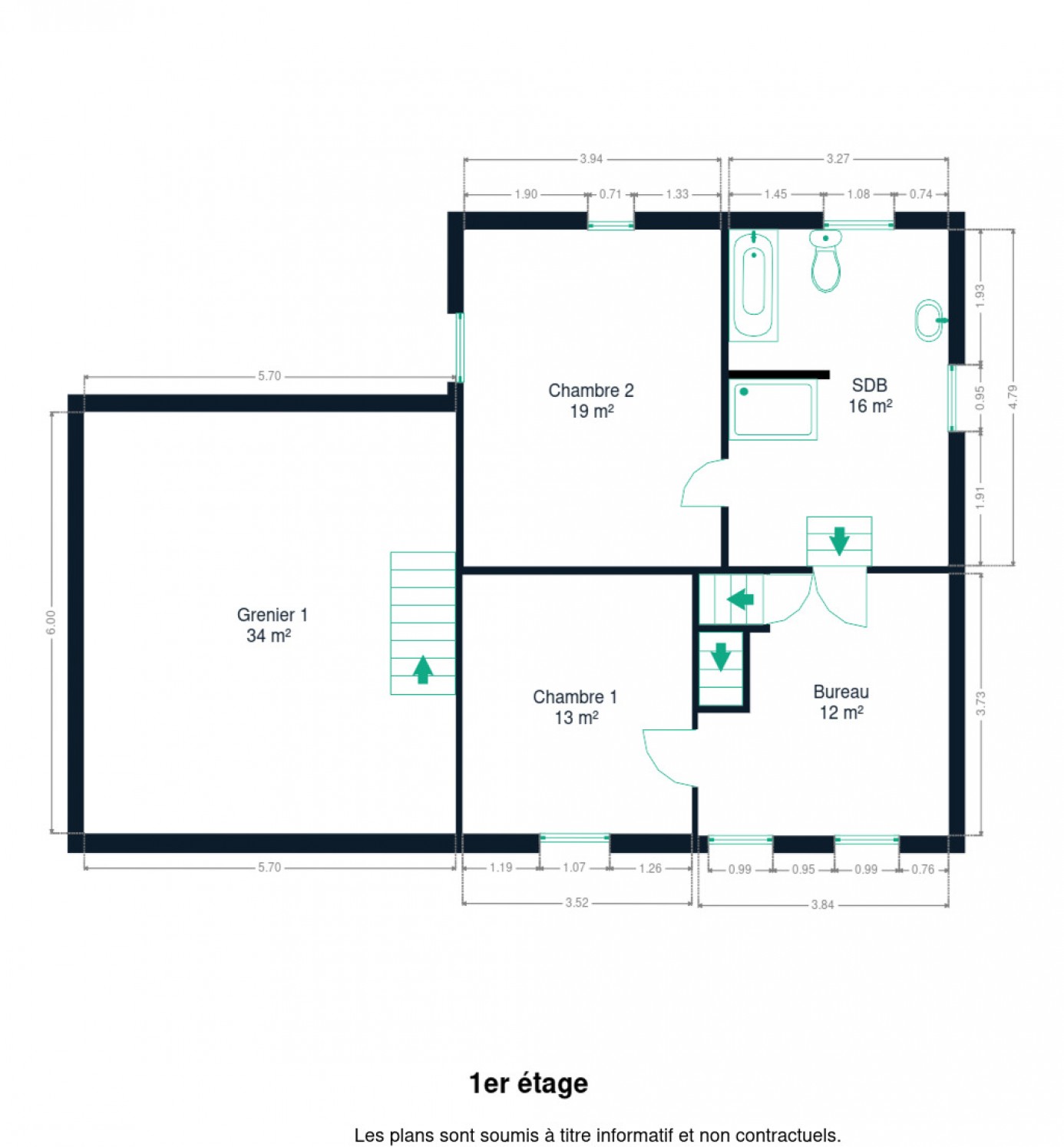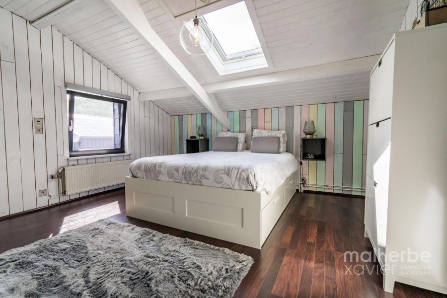 1er étage : vaste palier desservant deux chambres à coucher et une salle de bains, vaste grenier (34 m²) aménageable