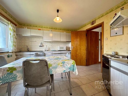 – Cuisine équipée : nombreux meubles sur mesure, cuisinière (taque et four) électrique, four à micro-ondes,hotte, frigo, évier avec égouttoir