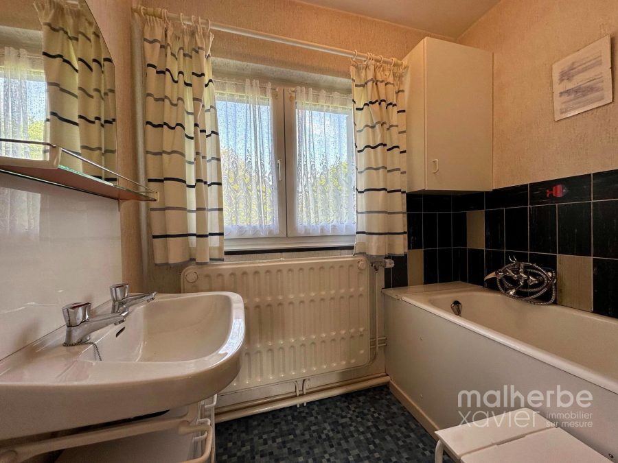– Salle de bains équipée carrelée sol et mur : bain, lavabo avec miroir