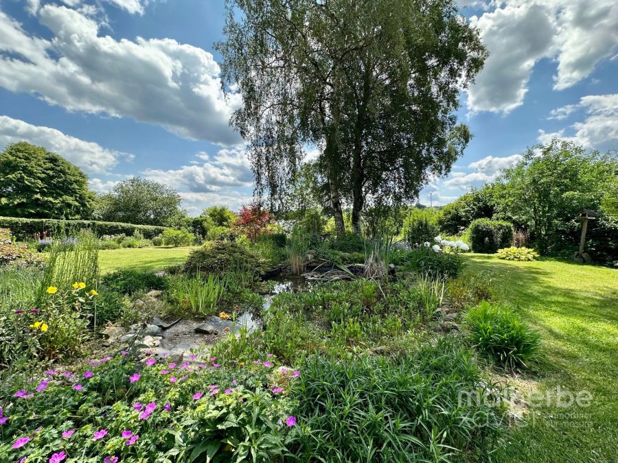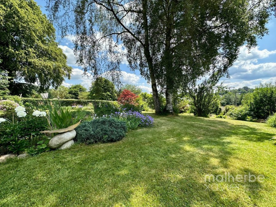 Extérieur : quatre emplacements de parking, garage, superbe jardin aménagé, fleuri avec un étang, grande terrasse carrelée avec vue