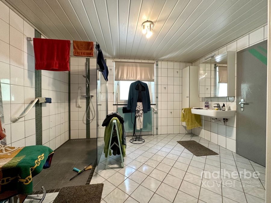 – Salle de bains équipée PMR carrelée sol et mur : grande douche « à l’italienne », évier avec miroir intégré