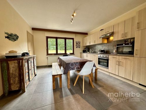 – Cuisine équipée : nombreux meubles sur mesure, taque vitro-céramique 4 zones, four, hotte, frigo, évier, lave-vaisselle