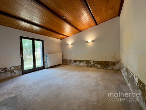 – entrée indépendante (arrière) vers l’appartement à rénover (innondé en juillet 2021, il a été nettoyé, seché et assaini) cuisine avec espace repas, salon, salle de bains et une chambre à coucher