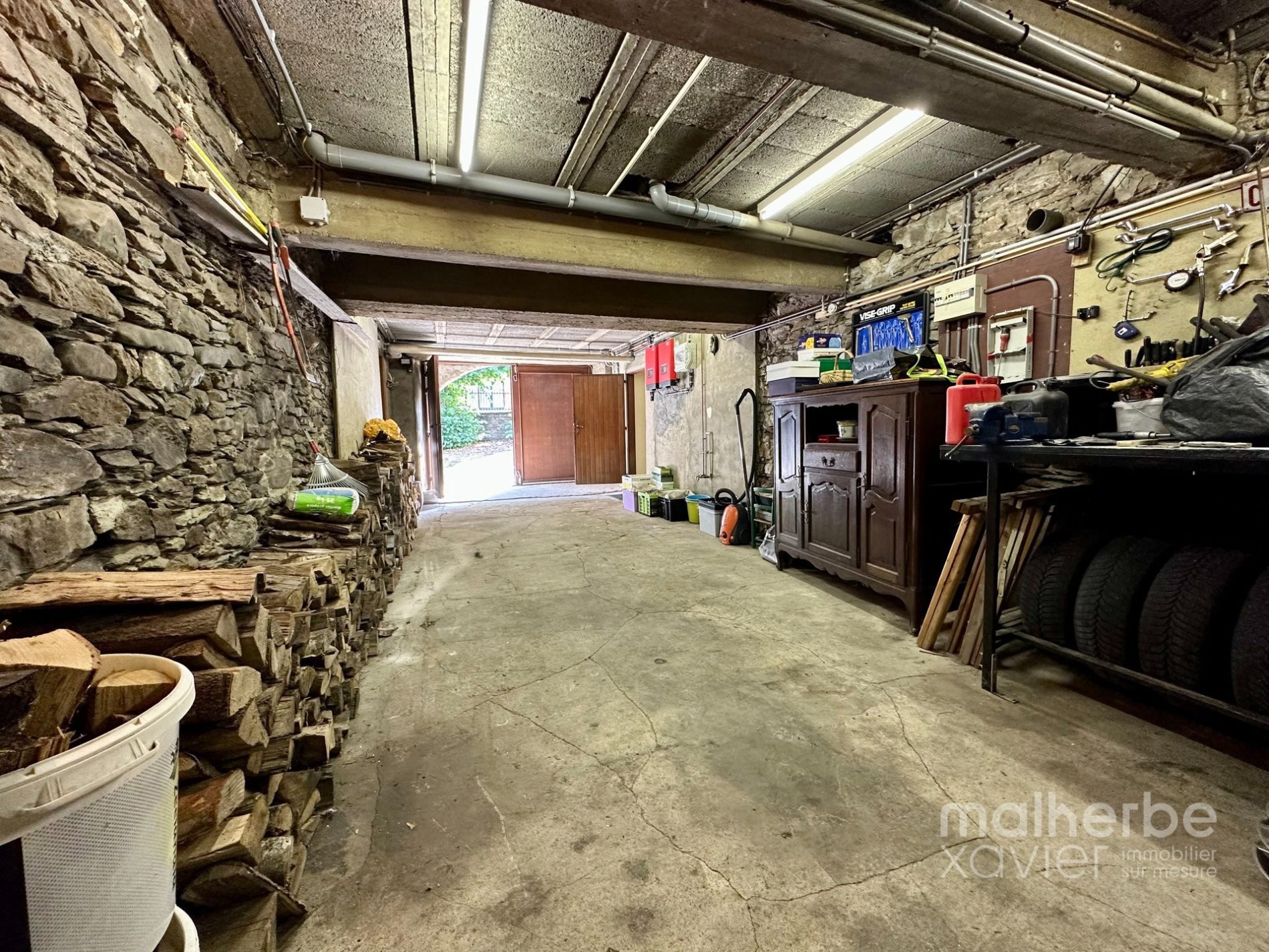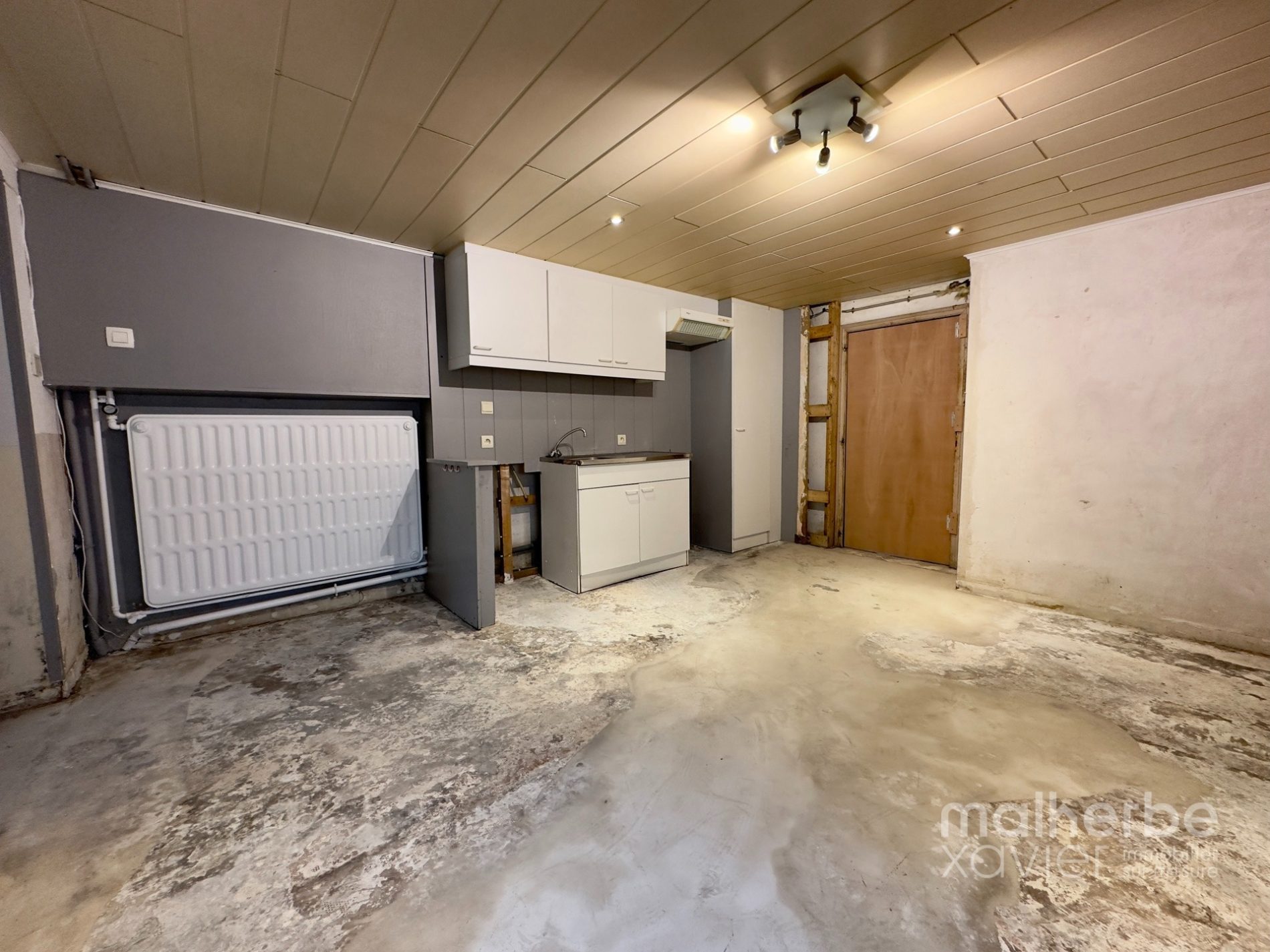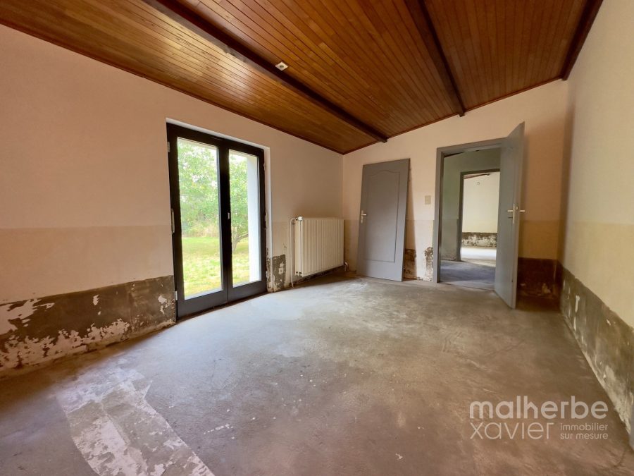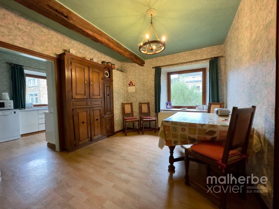 – entrée indépendante (arrière) vers l’appartement à rénover (innondé en juillet 2021, il a été nettoyé, seché et assaini) cuisine avec espace repas, salon, salle de bains et une chambre à coucher