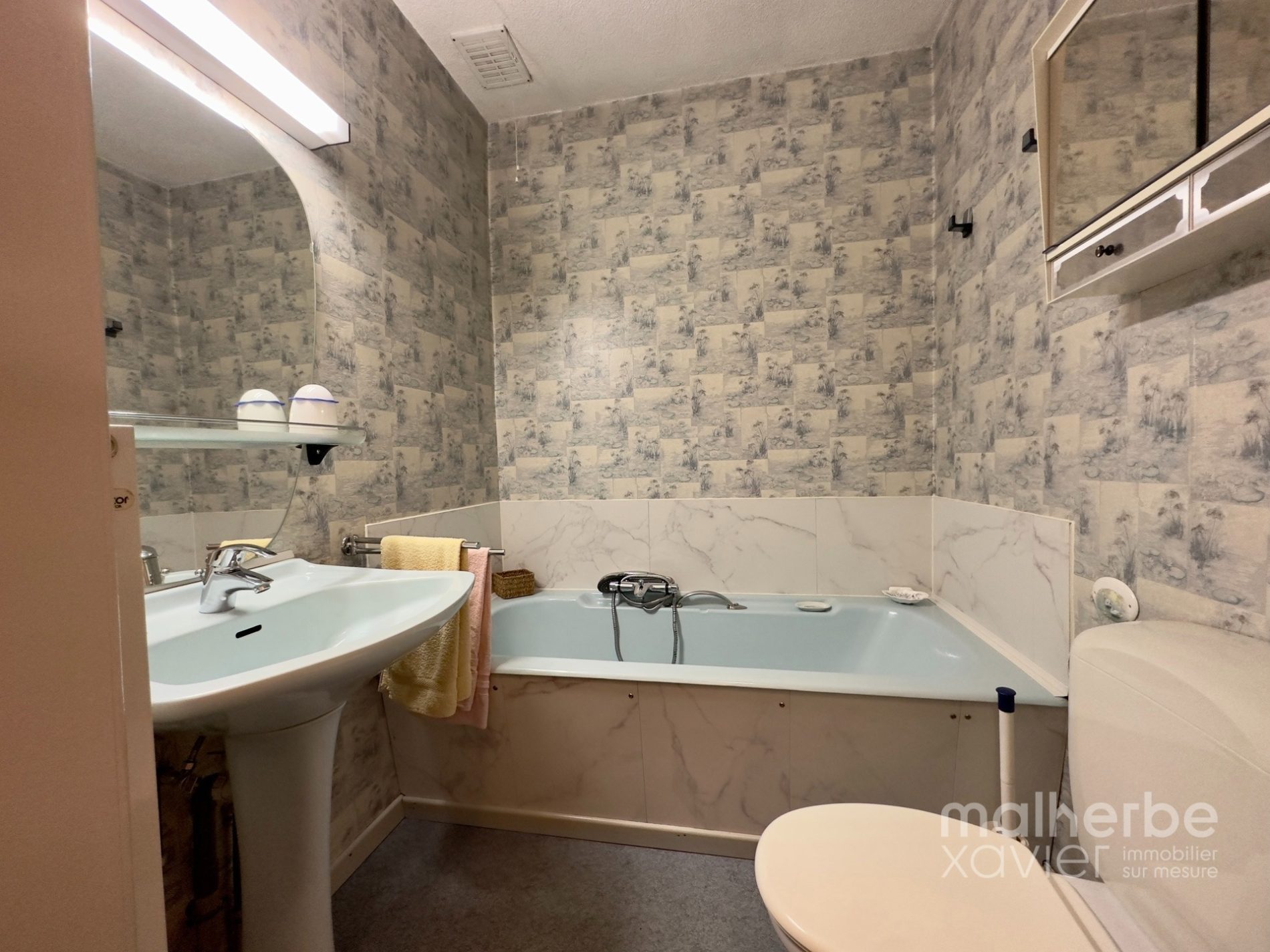 – Salle de bains équipée principale: bain, lavabo avec grand miroir, wc