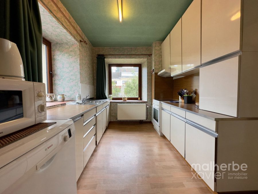 – Cuisine équipée: nombreux meubles, cuisinière électrique, hotte, frigo, lave-vaisselle