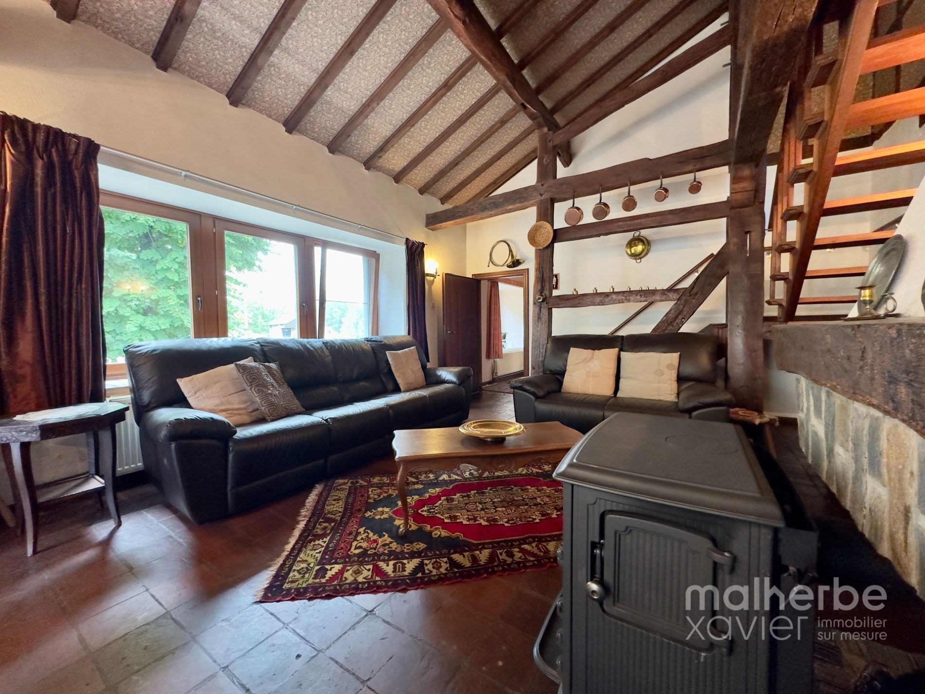 1er étage : superbe palier avec feu ouvert, magnifique living avec charpente apparente très lumineux donnant accès à la grande terrasse, cuisine équipée avec espace repas, hall de nuit desservant deux belles chambres à coucher et une salle de bains