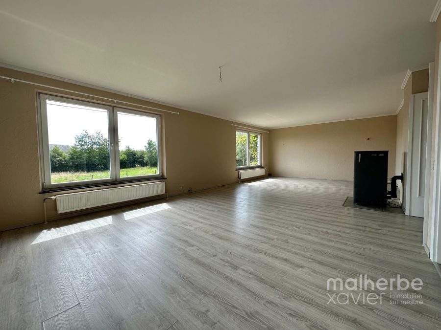 Rez-de-chaussée : vaste hall d’entrée avec wc indépendant, buanderie, grand living avec poêle à pellets, cuisine équipée, trois chambres à coucher, salle de bains équipée
