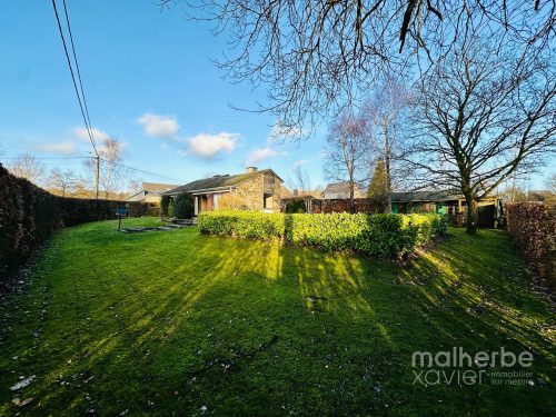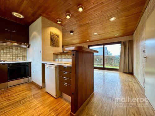 Rez-de-chaussée : sas d’entrée, superbe living traversant et très lumineux ouvert sur une cuisine équipée donnant accès à la terrasse et au jardin ; hall de nuit desservant 3 chambres à coucher, une salle de bain et un wc indépendant ; garage comprenant la chaufferie et la buanderie