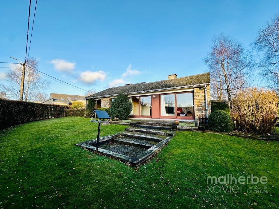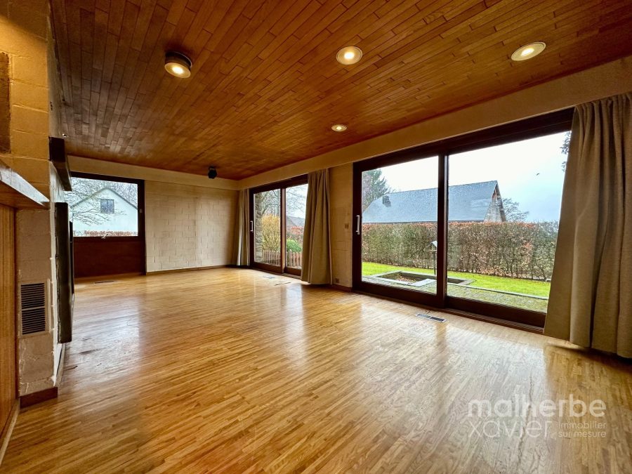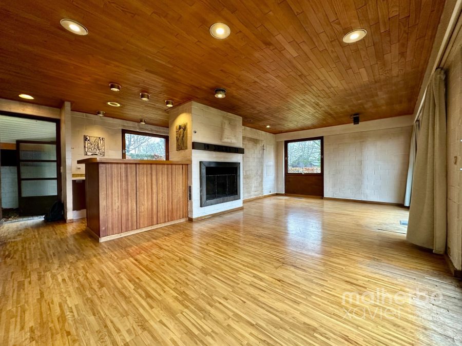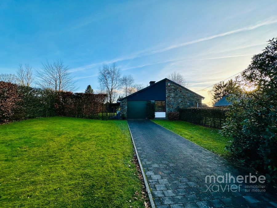 Rez-de-chaussée : sas d’entrée, superbe living traversant et très lumineux ouvert sur une cuisine équipée donnant accès à la terrasse et au jardin ; hall de nuit desservant 3 chambres à coucher, une salle de bain et un wc indépendant ; garage comprenant la chaufferie et la buanderie