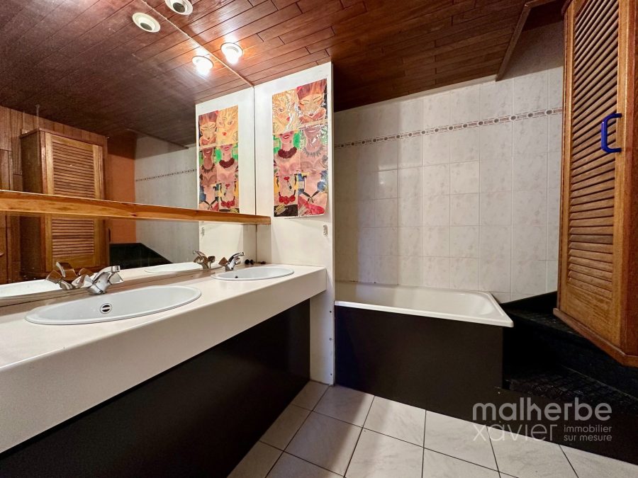 – Salle de bains équipée : bain, meuble double vasque avec grand miroir