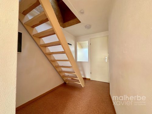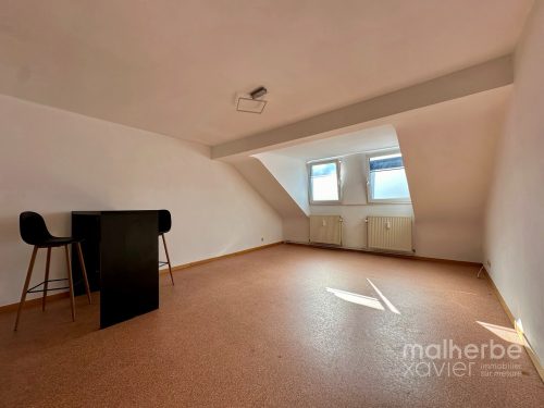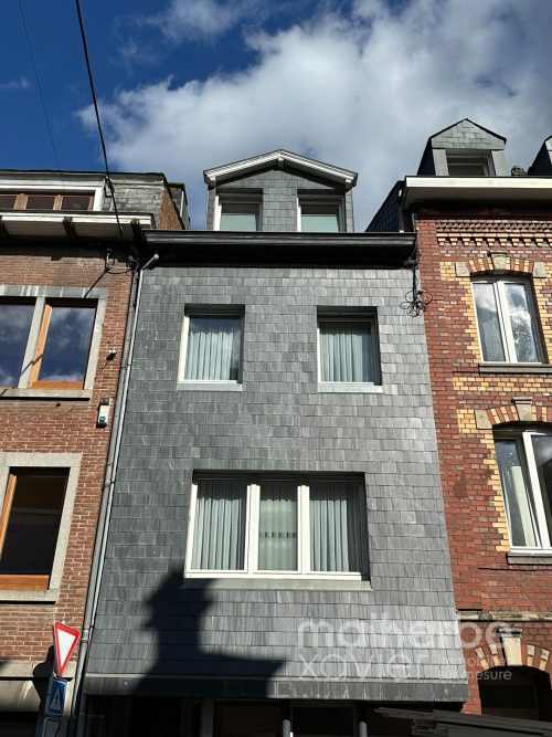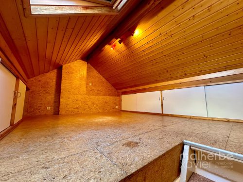 3e étage : hall d’entrée avec escalier menant à la chambre à coucher ; grand living lumineux, cuisine équipée donnant accès à la salle de bains équipée avec espace buanderie