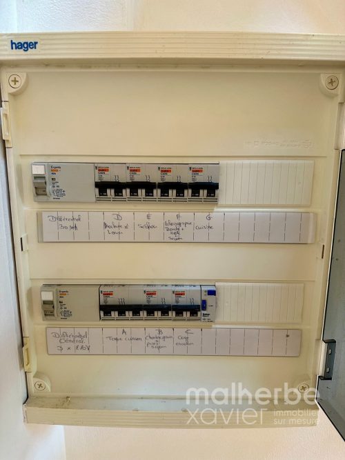 – Cuisine équipée : meubles sur mesure, taque vitro-céramique 4 zones, hotte, grand frigo avec tiroirs congélateur, évier