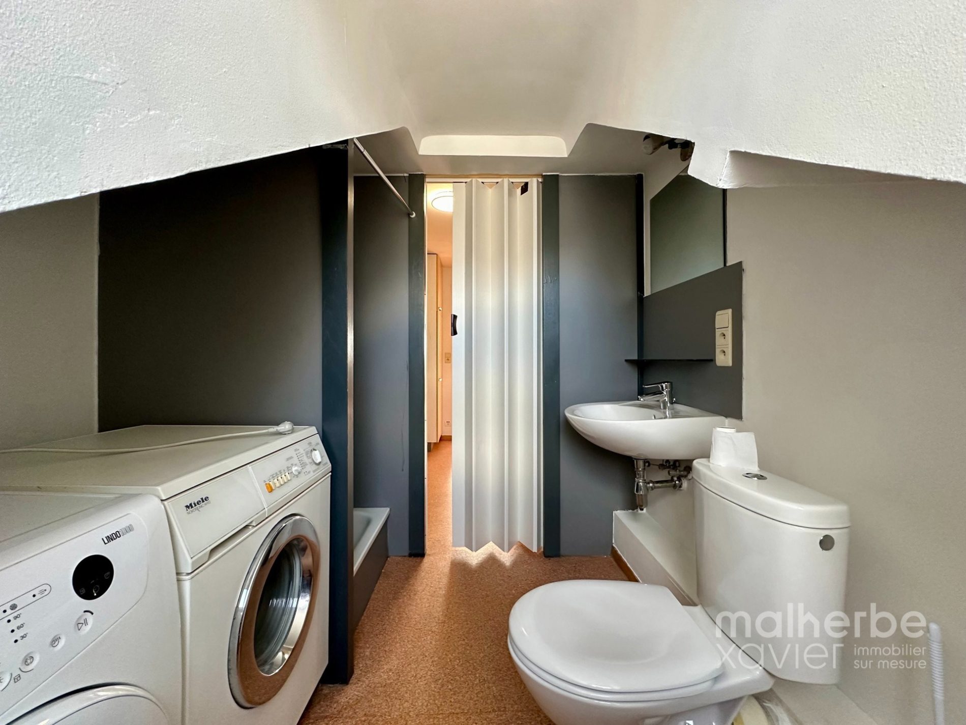 – Salle de bains équipée : cabine de douche , lavabo avec miroir, wc, machine à laver et sèchoir