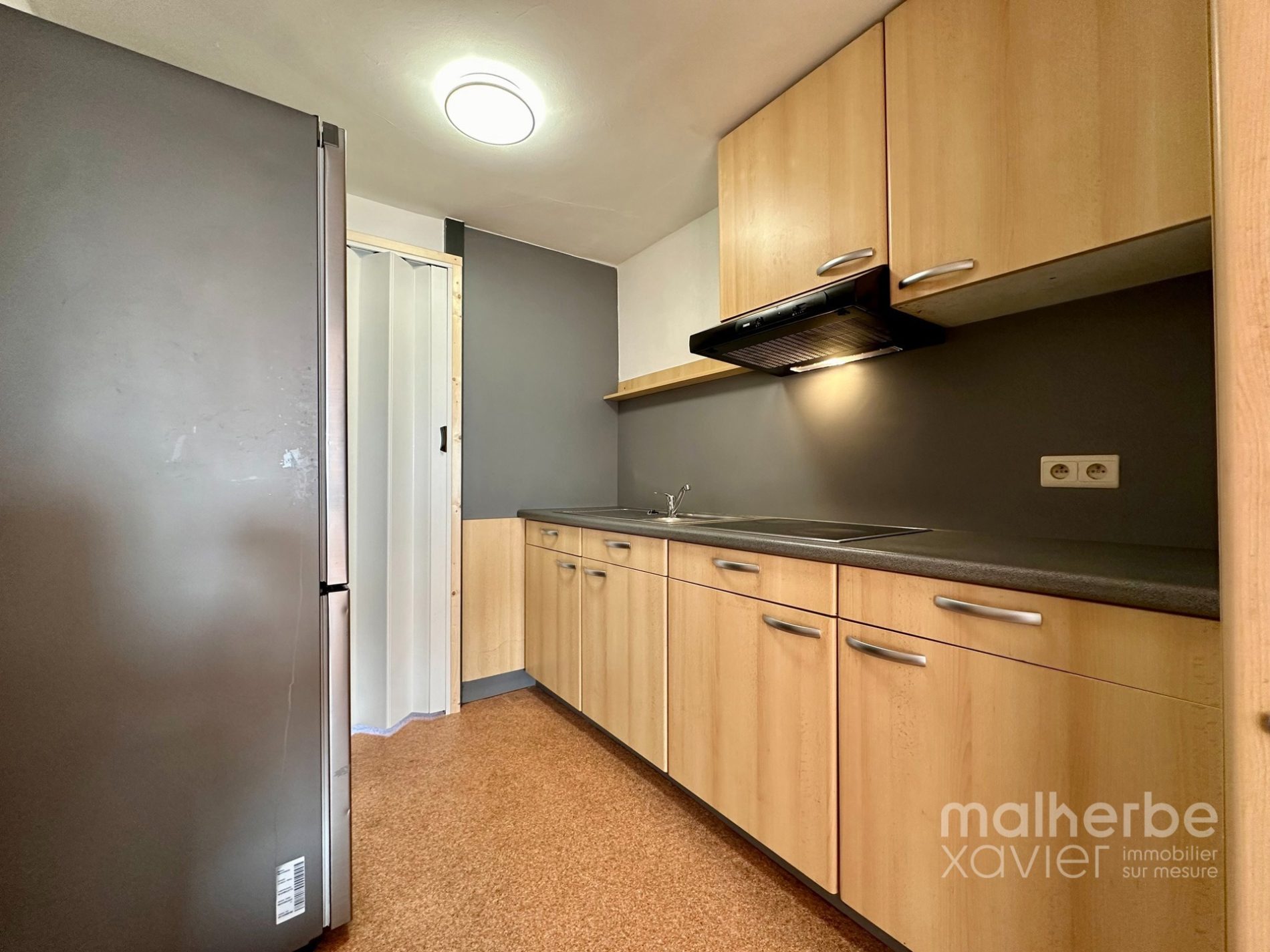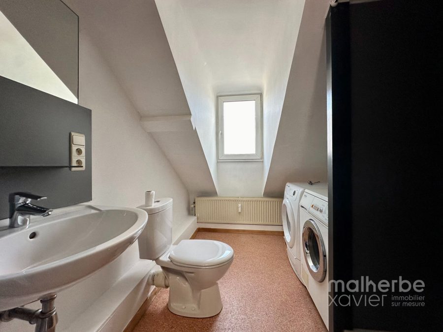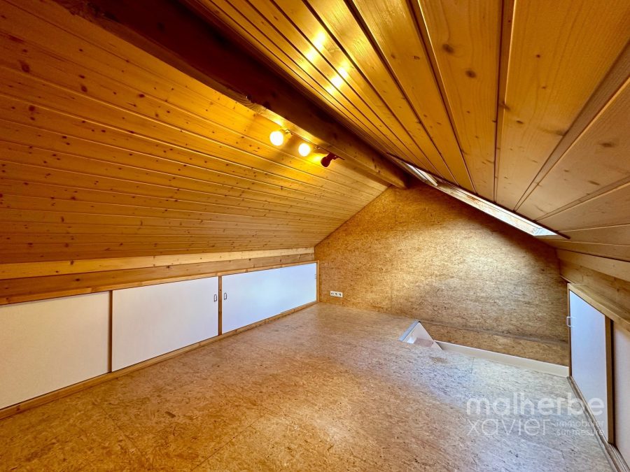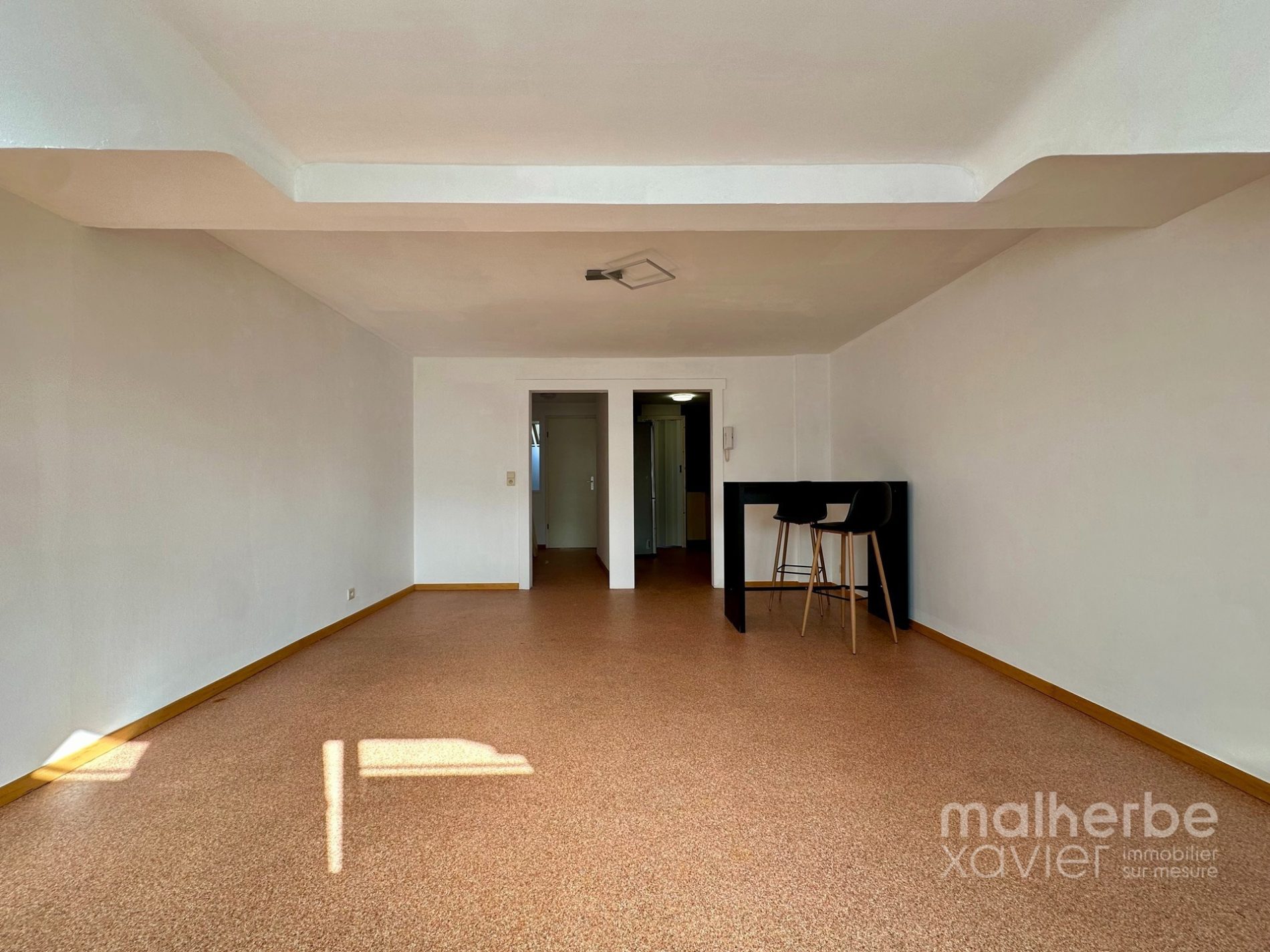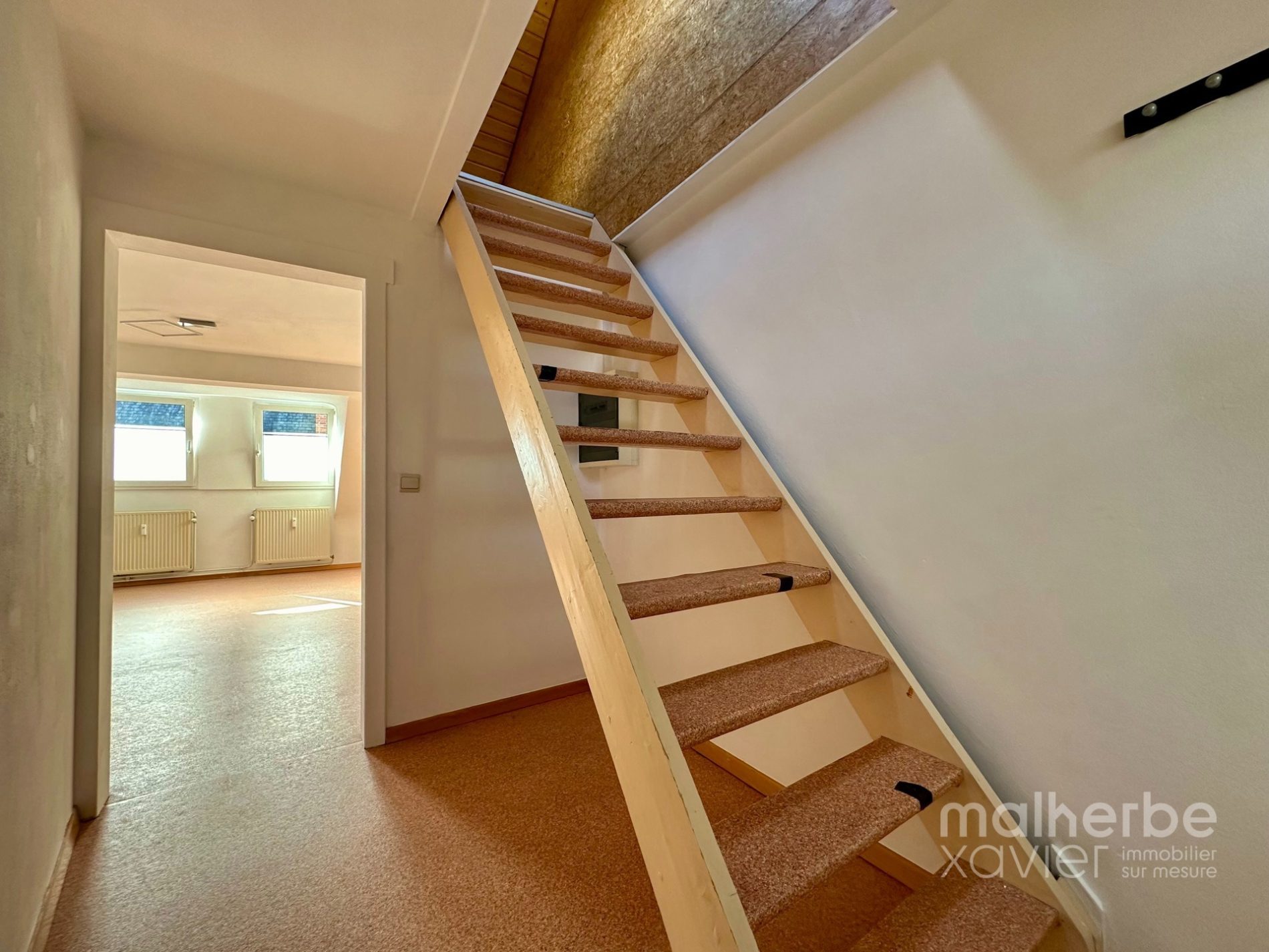 3e étage : hall d’entrée avec escalier menant à la chambre à coucher ; grand living lumineux, cuisine équipée donnant accès à la salle de bains équipée avec espace buanderie