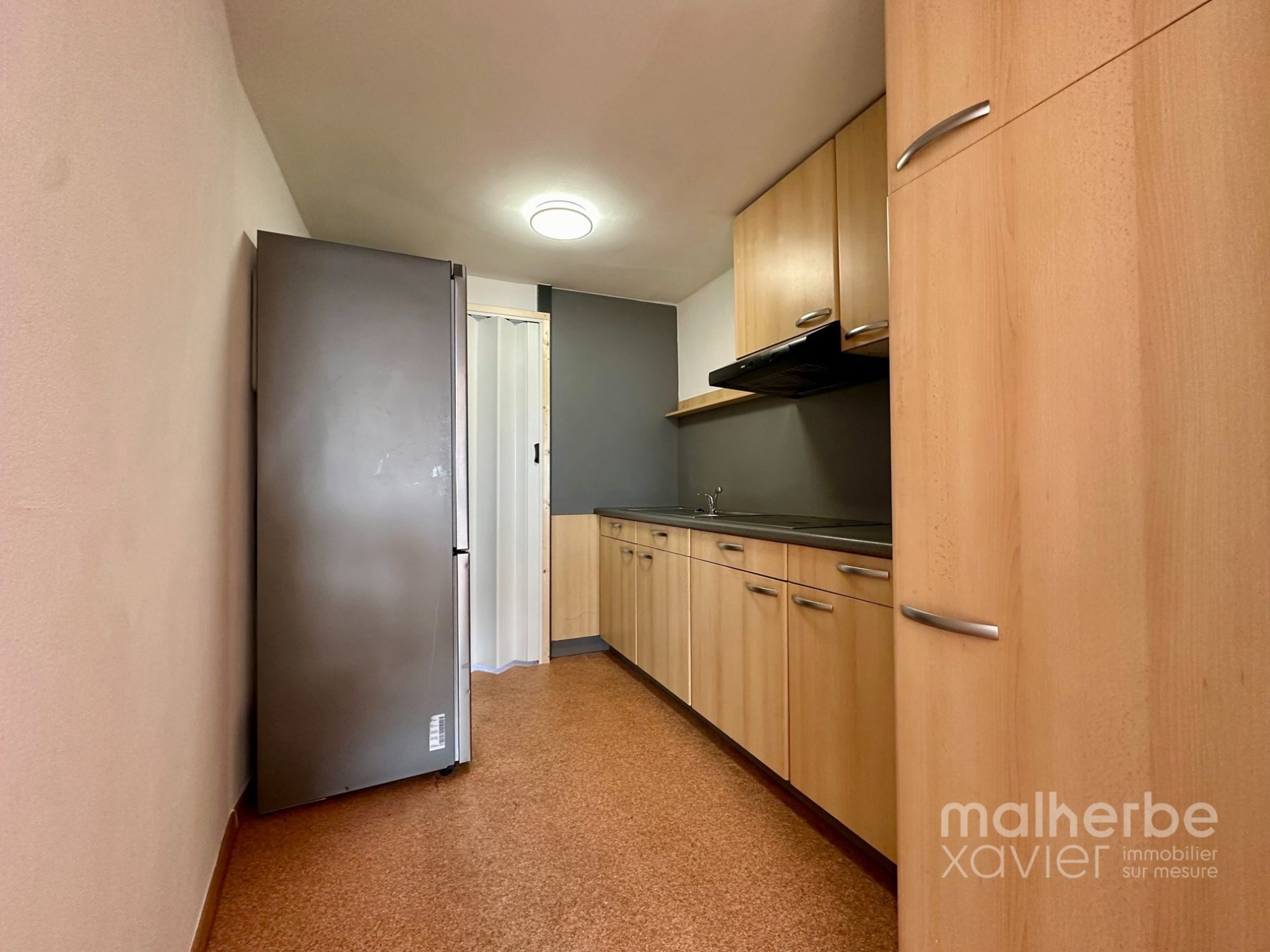 – Cuisine équipée : meubles sur mesure, taque vitro-céramique 4 zones, hotte, grand frigo avec tiroirs congélateur, évier