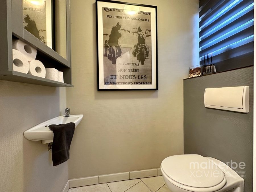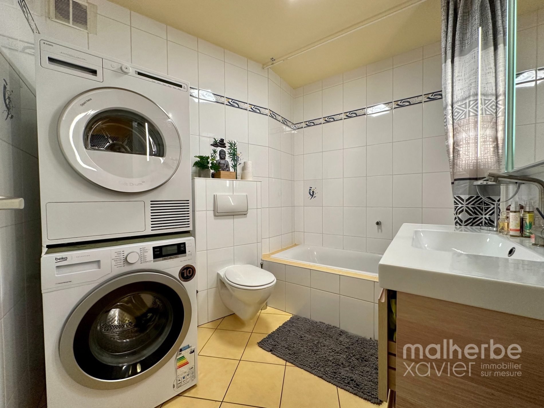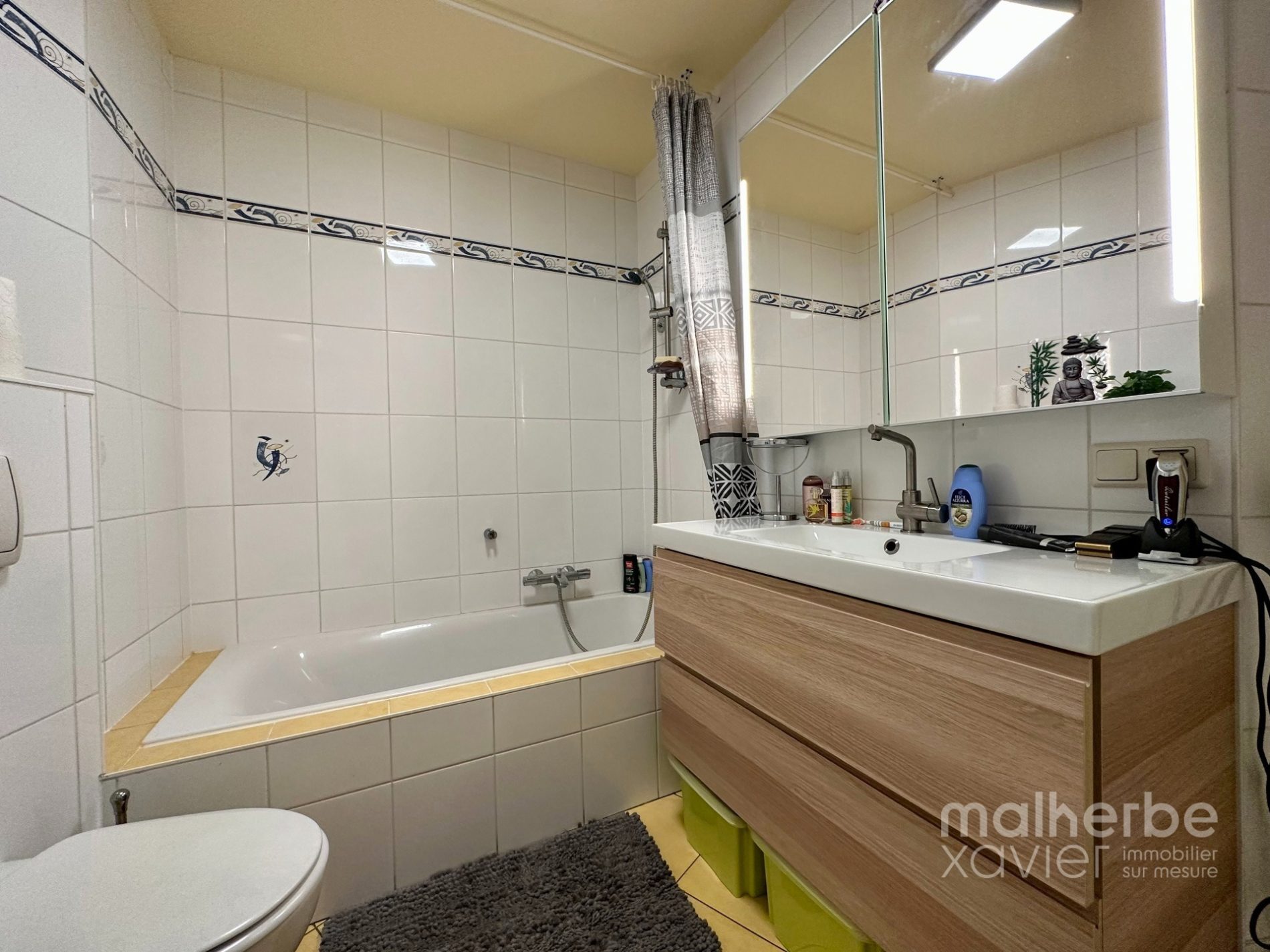 – Salle de bains équipée: bain-douche, meuble évier avec grand miroir éclairé, wc, raccord machine