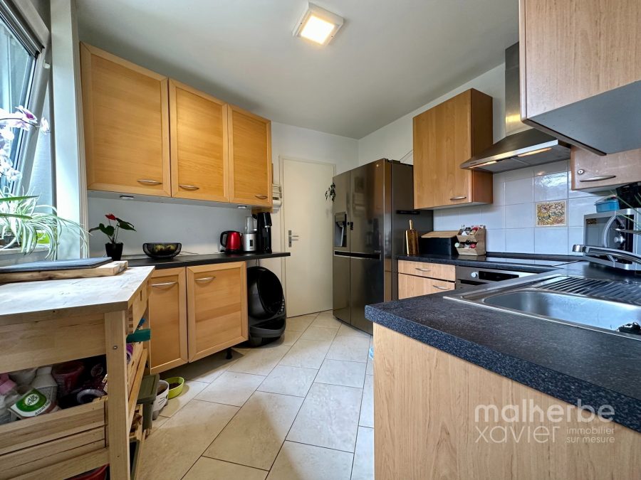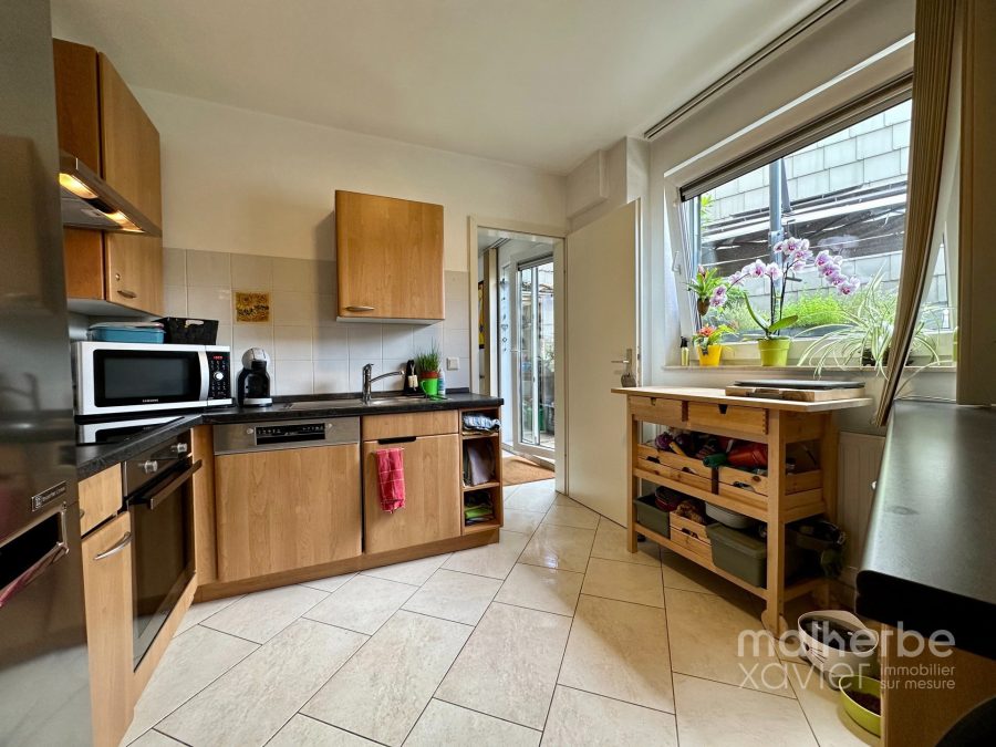 1er étage : palier, appartement : vaste hall d’entrée, wc indépendant, grand living traversant très lumineux donnant accès à la terrasse, cuisine équipée, chambre à coucher ou bureau; hall de nuit desservant deux chambres à coucher dont une avec balcon, salle de bains équipée