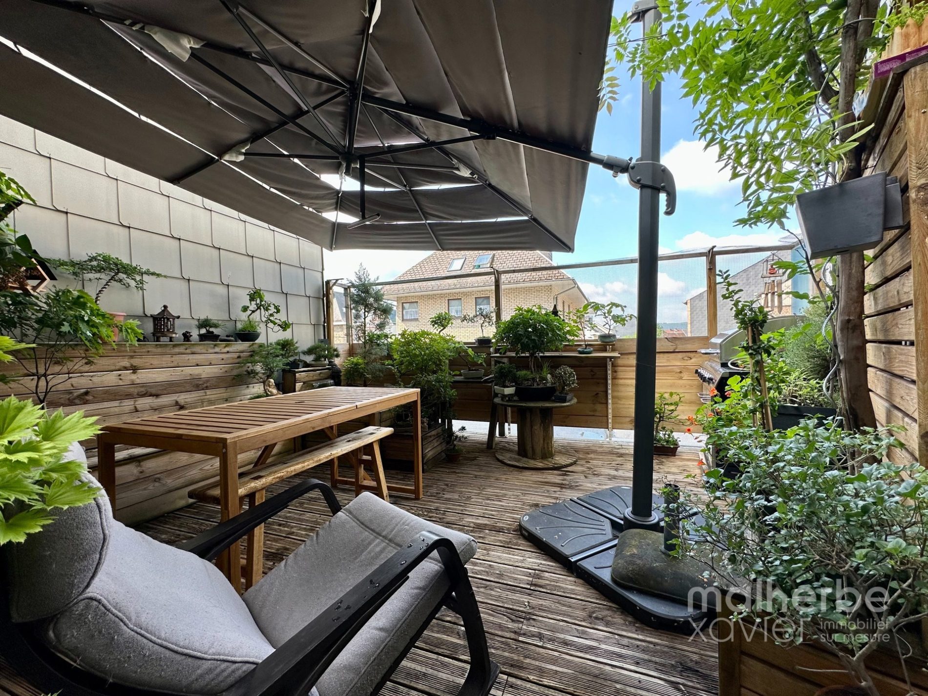 Extérieur : superbe terrasse de 17 m² orientée Sud-Ouest, balcon de 3 m²
