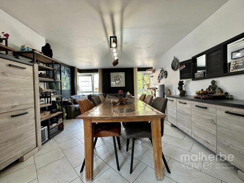 – Cuisine équipée: nombreux meubles sur mesure, une taque vitro céramique quatre zones, hotte, four, frigo américain, lave-vaisselle, évier