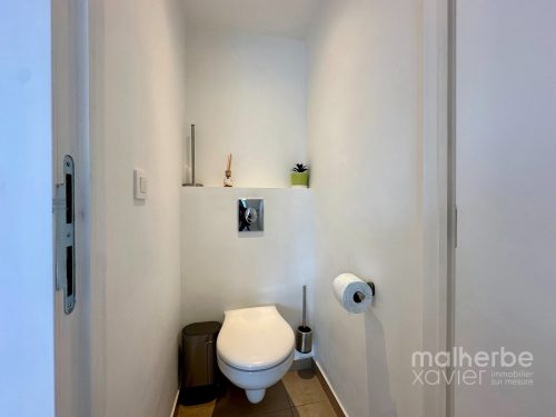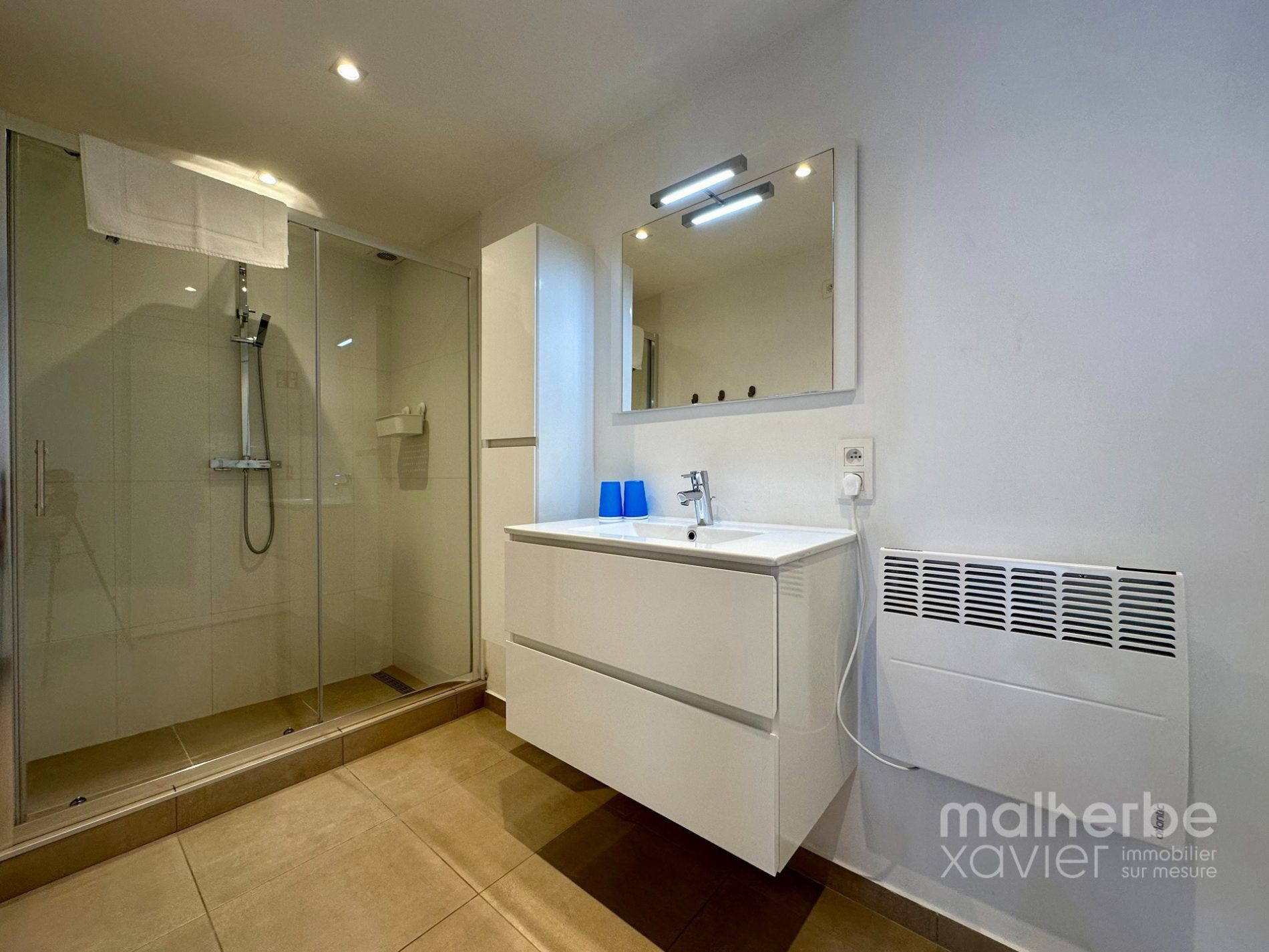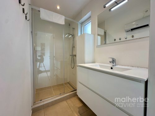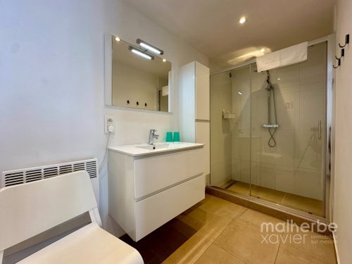 – Salles de bain équipée : douche, meuble lavabo, miroir avec éclairages intégrés, wc + chauffage d’appoint électrique