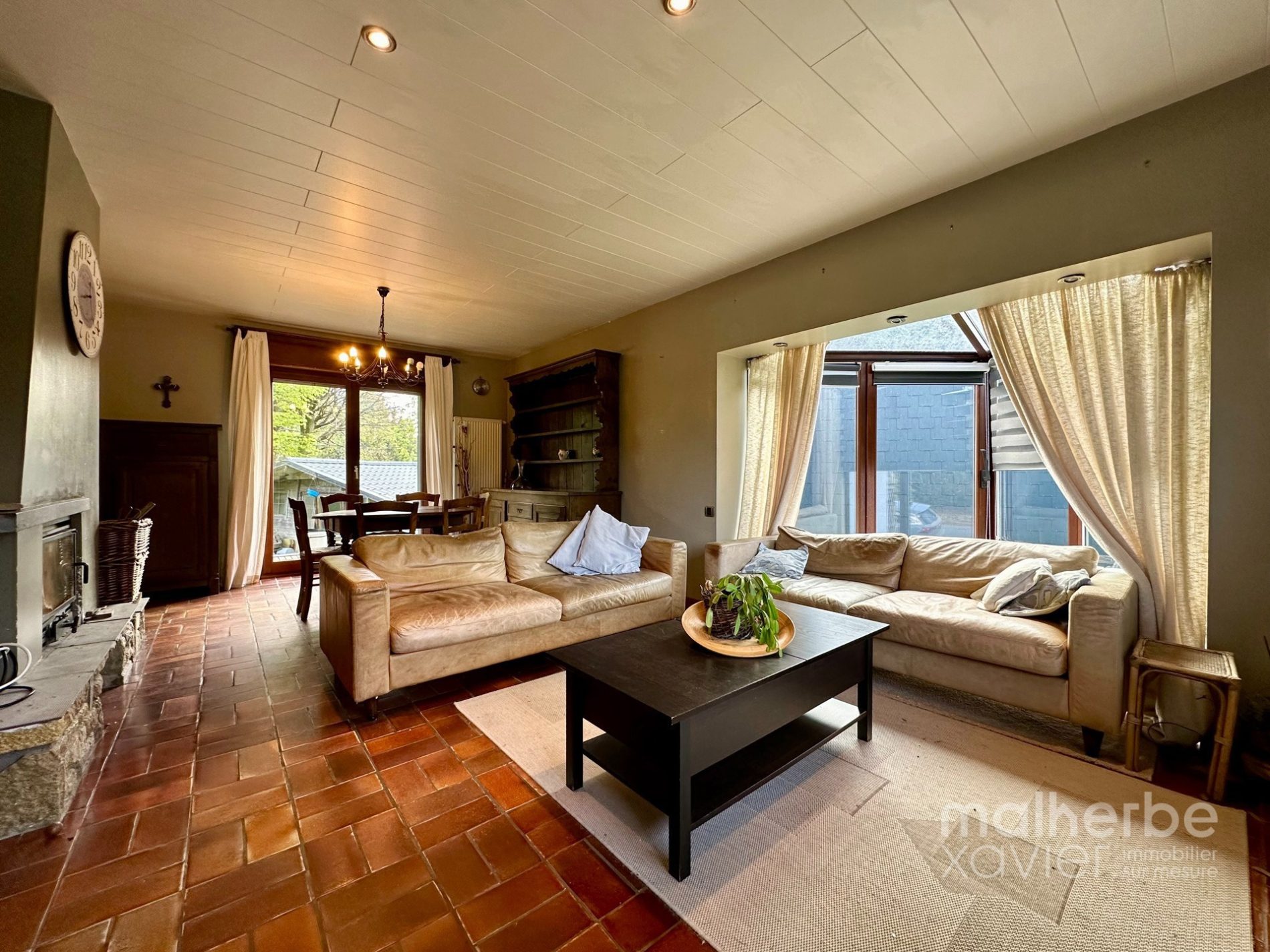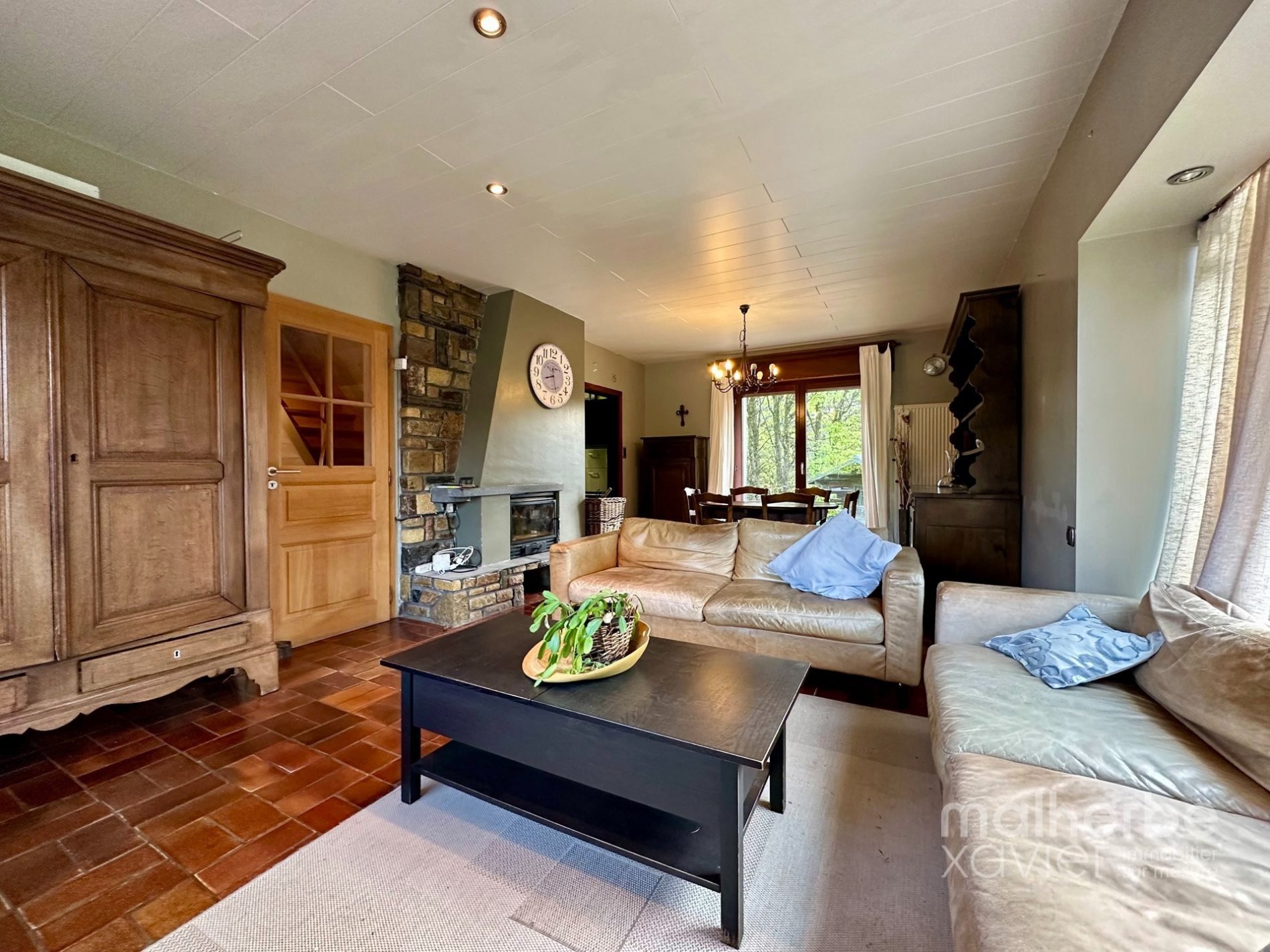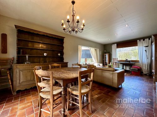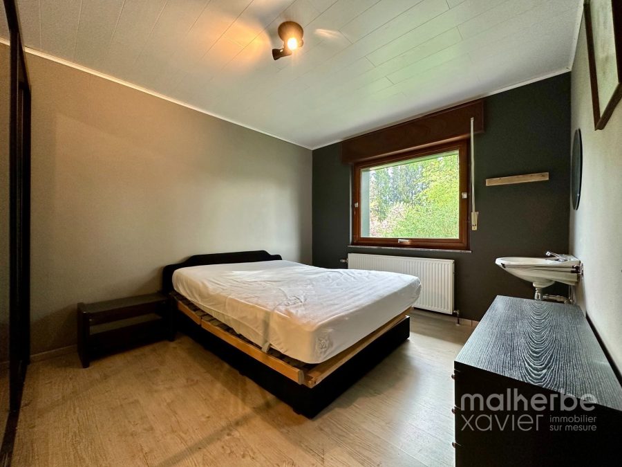 Rez-de-chaussée : hall d’entrée, superbe living traversant donnant accès à la terrasse et au jardin, cuisine semi-équipée avec espace repas ; hall de nuit desservant deux belles chambres à coucher et une salle de bain équipée