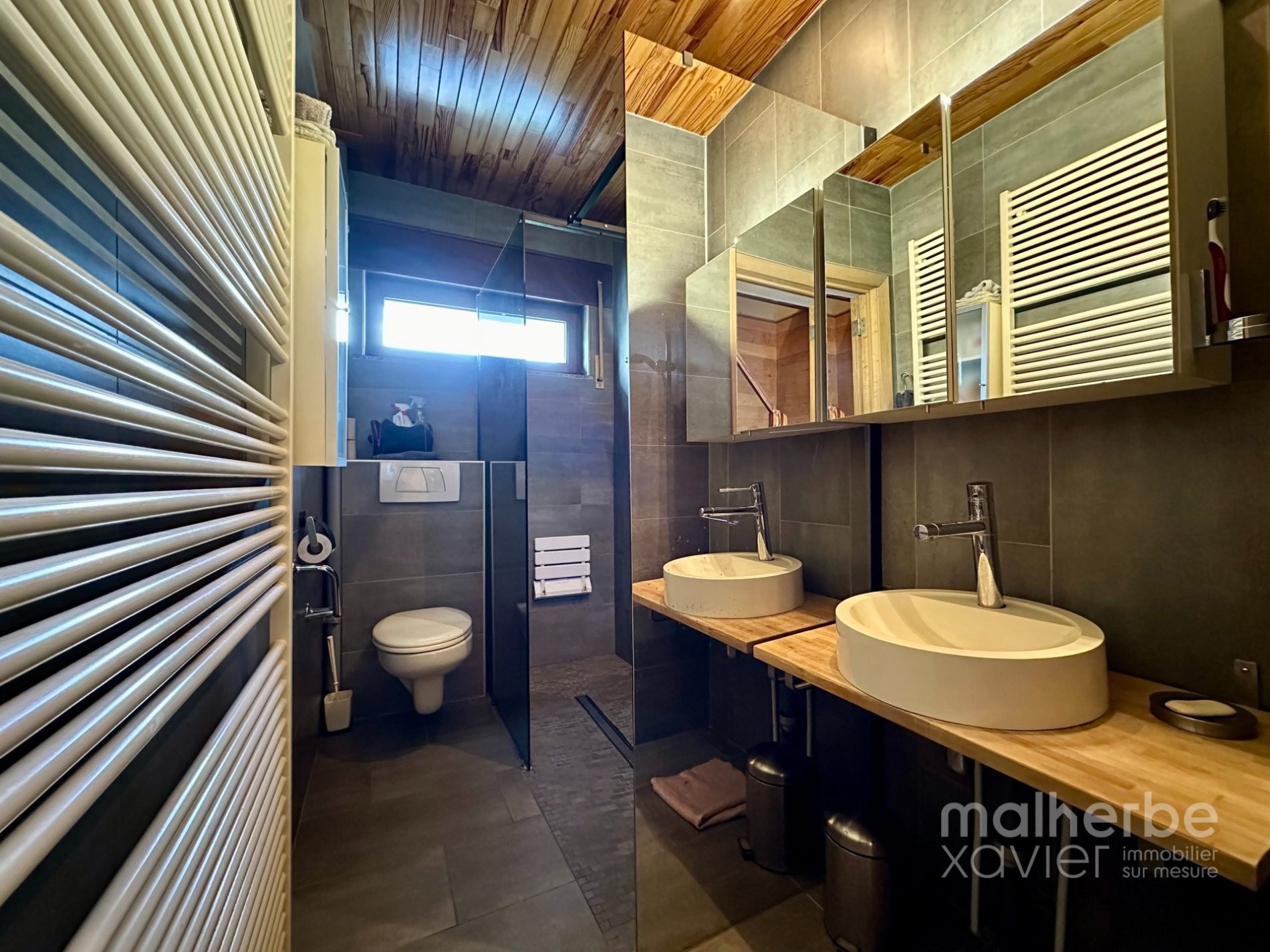 – Salle de bains équipée rez : douche à l’italienne, évier avec grand miroir éclairé, wc