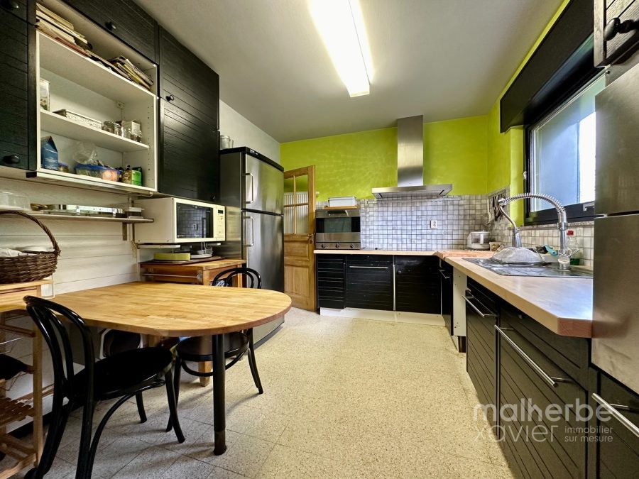 – Cuisine semi-équipée: meubles en bois, plan de travail en bois massif, une taque vitrocéramique 4 zones, friteuse encastrée, hotte, évier