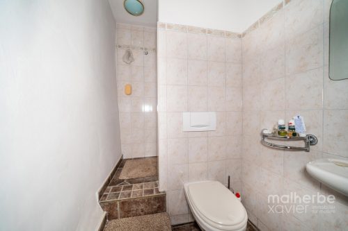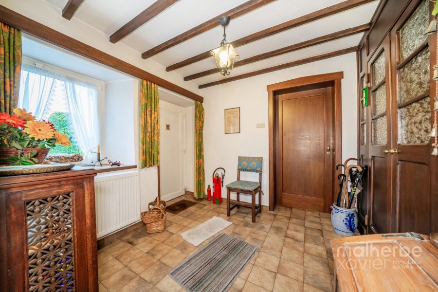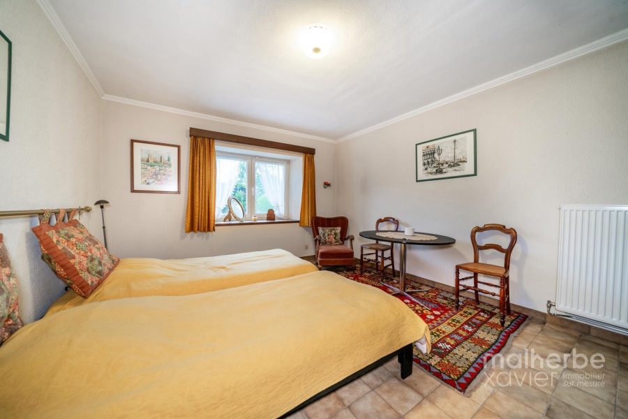 Rez-de-chaussée : hall d’entrée carrelé, superbe living traversant carrelé très lumineux, cuisine équipée avec espace repas, chambre à coucher, salle de bains ; seconde entrée desservant une magnifique salle de réception avec bar et feu ouvert donnant accès à la grande terrasse et jardin, salle de douche avec wc
