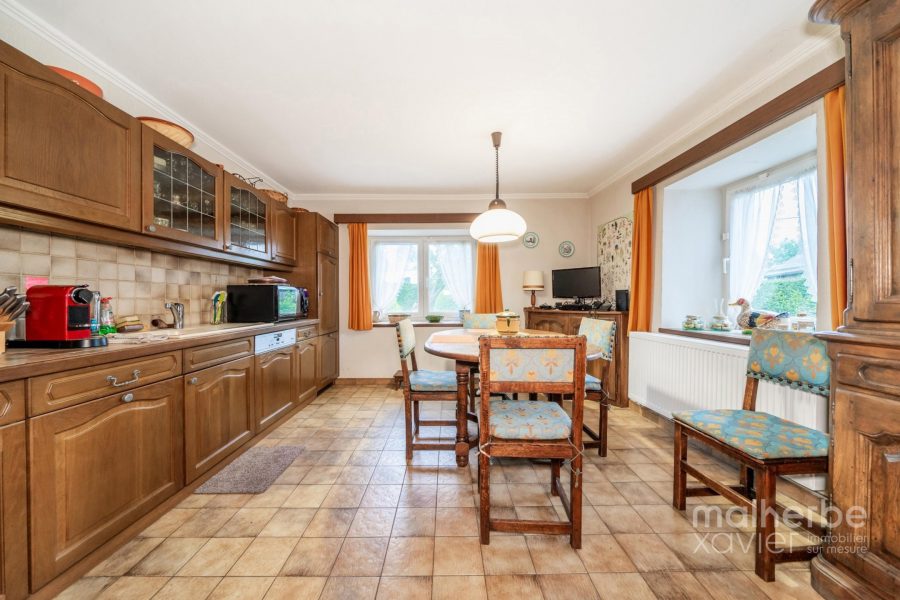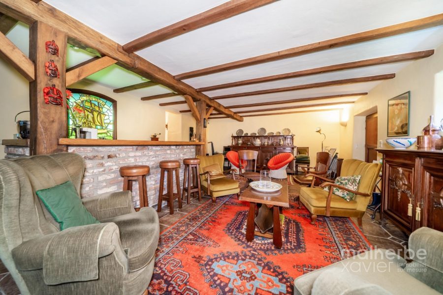 – Cuisine équipée: nombreux meubles sur mesure en chêne d’époque, vitrocéramique 4 zones, four, hotte, évier, lave-vaisselle et frigo