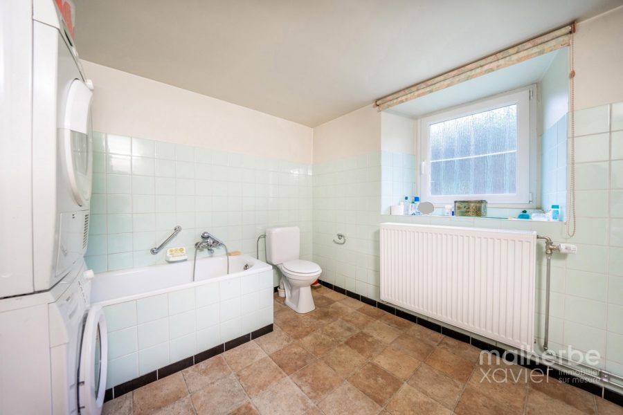 – Salle de bains rez : bain, évier avec miroir et raccord machine à laver