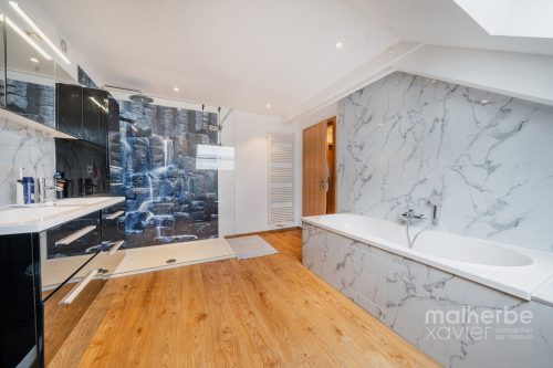 – Salle de bains 2e étage : bain, grande douche à l’italienne, meuble laqué noir double évier avec miroir éclairé, wc