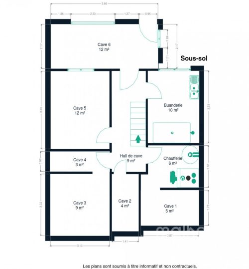 Sous-sol : hall de cave desservant 6 caves, une chaufferie et une buanderie + accès jardin