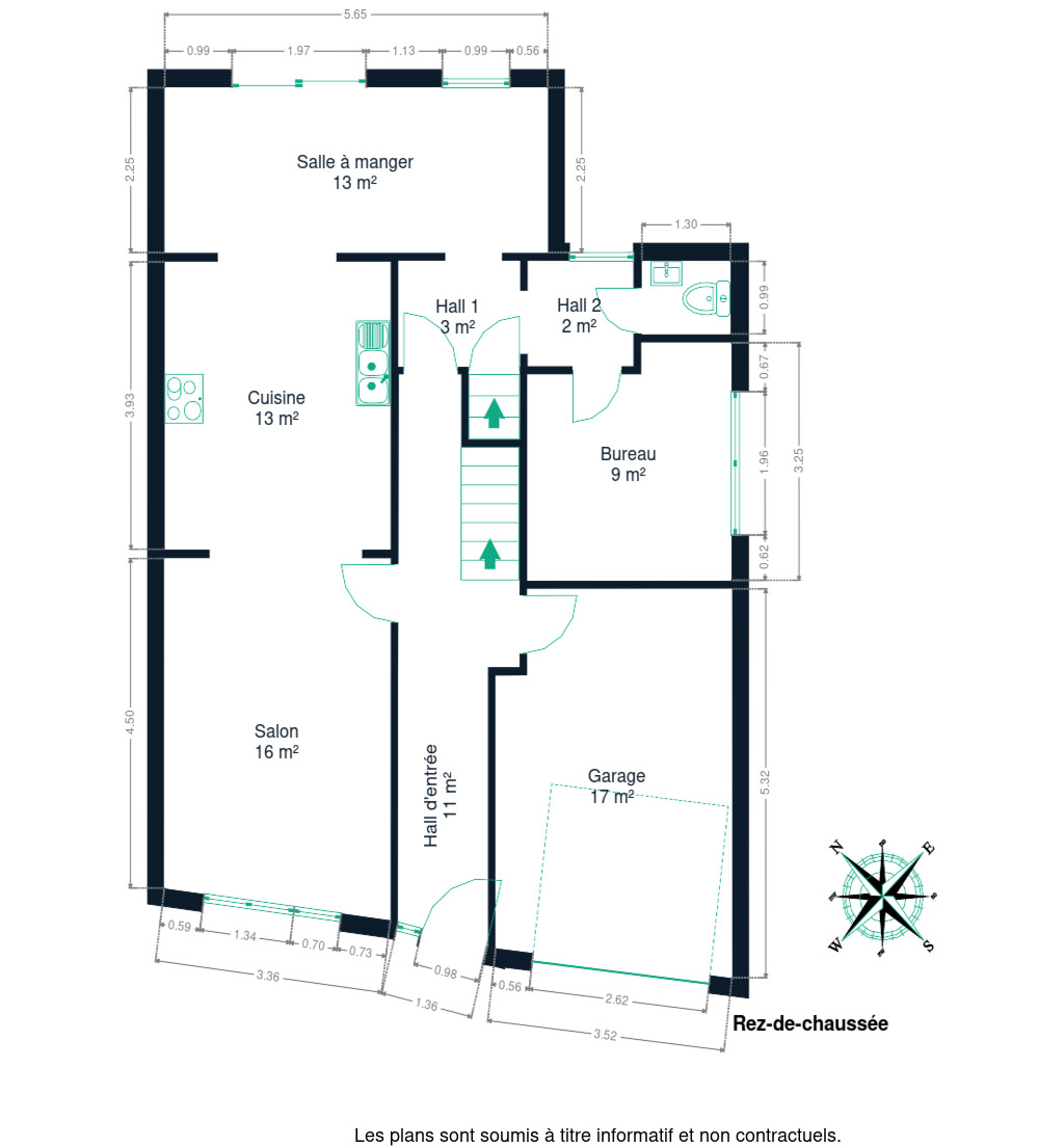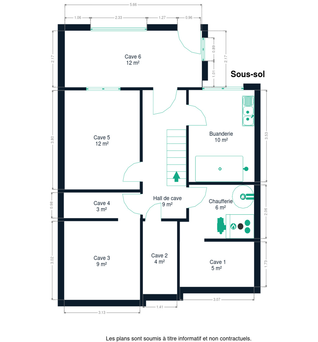 Sous-sol : hall de cave desservant 6 caves, une chaufferie et une buanderie + accès jardin